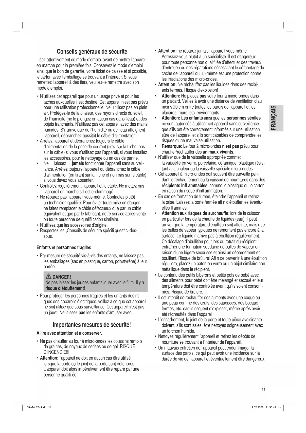 - Attention: en fonctionnement micro-ondes seulement, placez un couvercle de protection sur la nourriture. 05-MW 764.indd 1205-MW 764.indd 12 19.02.2008 11:36:43 Uhr19.02.2008 11:36:43 Uhr13 FRANÇAIS FRANÇAIS