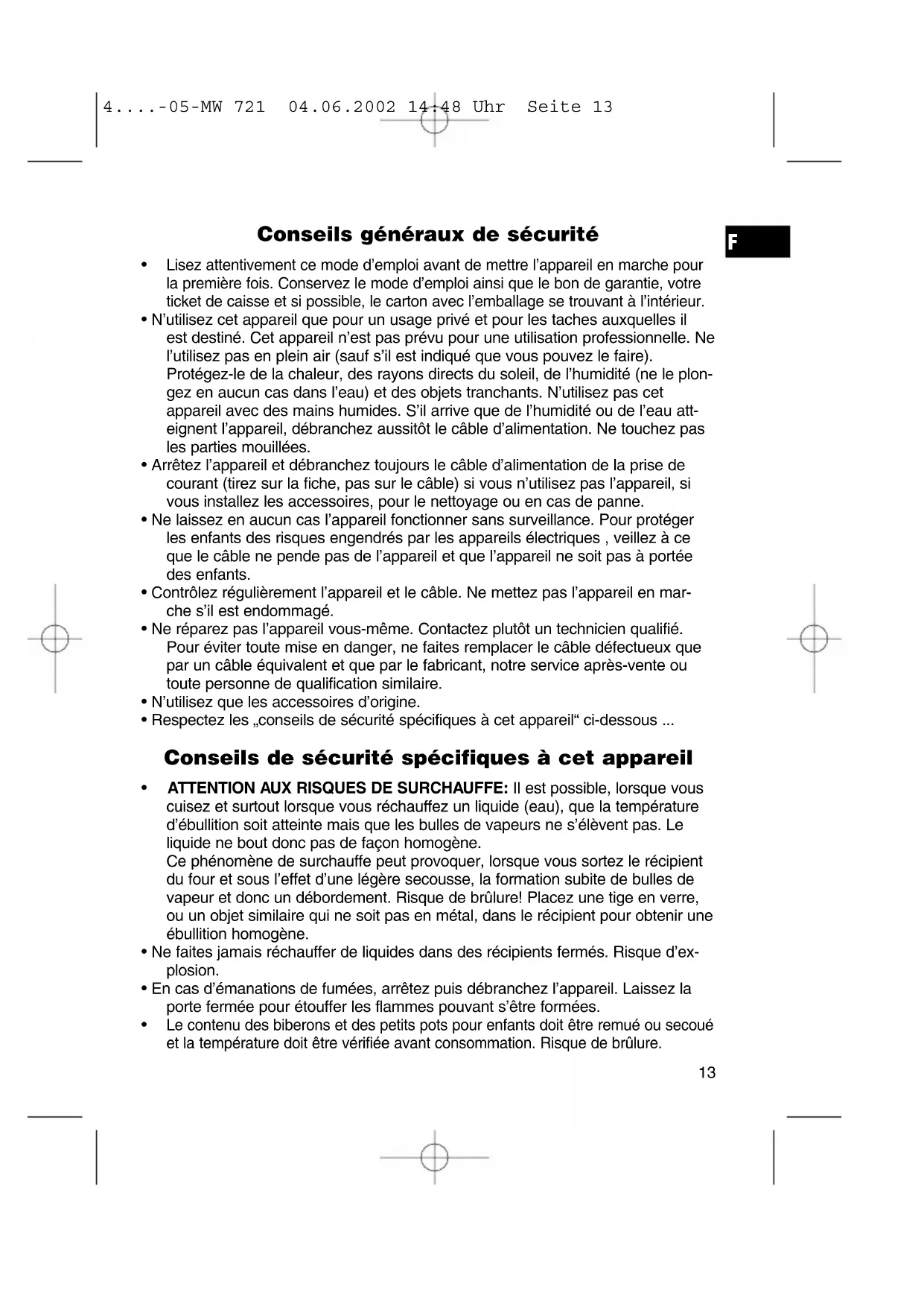 Le temps de cuisson dépend de la quantité et la consistance du contenu. Après quelques utilisations, vous apprendrez vite à estimer le temps de cuisson. Faîtes attention: la préparation est beaucoup plus rapide dans un four à micro- ondes que dans un four traditionnel. Si vous n’êtes pas sûr, programmez plutôt un temps de cuisson plus court et renouvelez l’opération le cas échéant. L’appareil se met en marche après la programmation du temps de cuisson. La lumière intérieur est alors allumée. 4....-05-MW 721 04.06.2002 14:48 Uhr Seite 15Si vous voulez programmer un temps de cuisson inférieur à 3 minutes, tournez le bouton d’abord sur la marque des 10 minutes puis en arrière. La programma- tion est alors plus exacte.