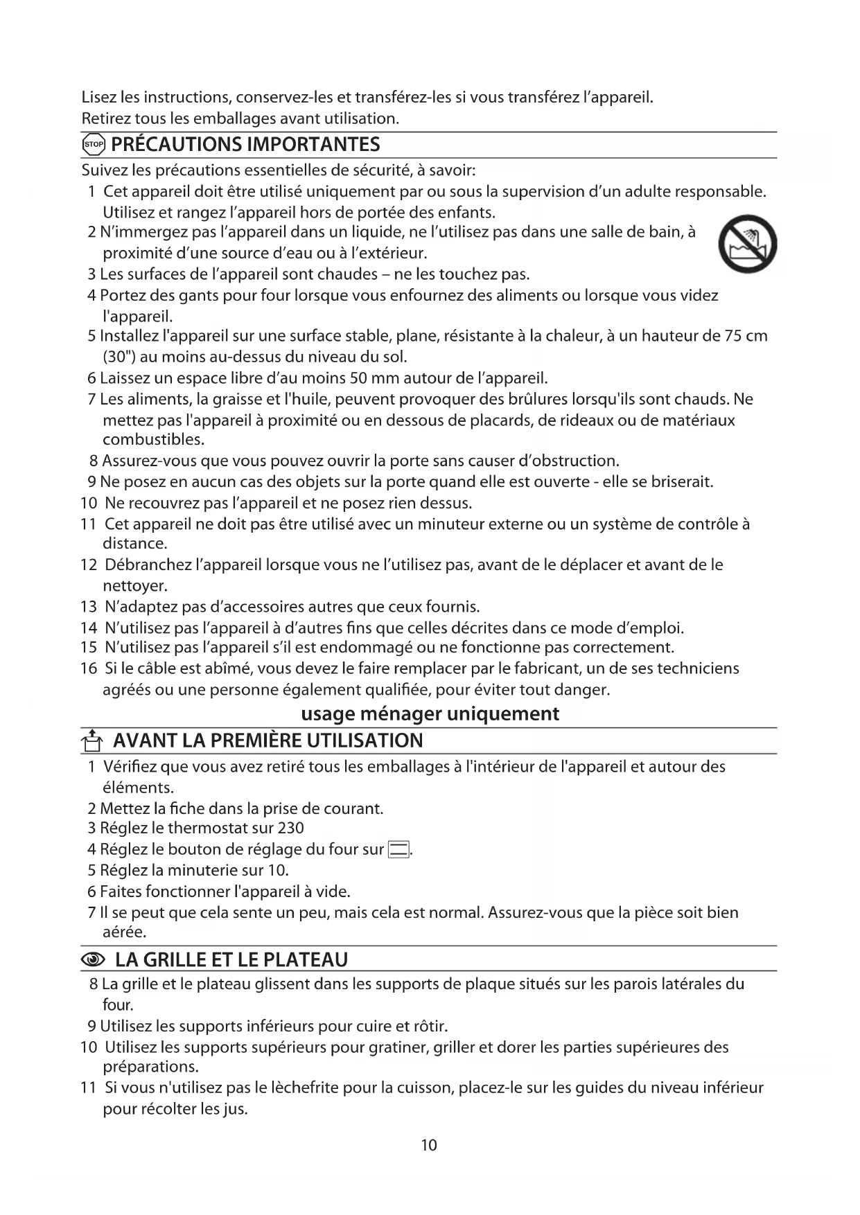 Suivez les précautions essentielles de sécurité, à savoir: 1 Cet appareil doit être utilisé uniquement par ou sous la supervision d’un adulte responsable. Utilisez et rangez l’appareil hors de portée des enfants. 2 N’immergez pas l’appareil dans un liquide, ne l’utilisez pas dans une salle de bain, à proximité d’une source d’eau ou à l’extérieur. 3 Les surfaces de l’appareil sont chaudes – ne les touchez pas. 4 Portez des gants pour four lorsque vous enfournez des aliments ou lorsque vous videz l'appareil. 5 Installez l'appareil sur une surface stable, plane, résistante à la chaleur, à un hauteur de 75 cm (30") au moins au-dessus du niveau du sol. 6 Laissez un espace libre d’au moins 50 mm autour de l’appareil. 7 Les aliments, la graisse et l'huile, peuvent provoquer des brûlures lorsqu'ils sont chauds. Ne mettez pas l'appareil à proximité ou en dessous de placards, de rideaux ou de matériaux combustibles. 8 Assurez-vous que vous pouvez ouvrir la porte sans causer d’obstruction. 9 Ne posez en aucun cas des objets sur la porte quand elle est ouverte - elle se briserait. 10 Ne recouvrez pas l’appareil et ne posez rien dessus. 11 Cet appareil ne doit pas être utilisé avec un minuteur externe ou un système de contrôle à distance. 12 Débranchez l’appareil lorsque vous ne l’utilisez pas, avant de le déplacer et avant de le nettoyer. 13 N’adaptez pas d’accessoires autres que ceux fournis. 14 N’utilisez pas l’appareil à d’autres fins que celles décrites dans ce mode d’emploi. 15 N’utilisez pas l’appareil s’il est endommagé ou ne fonctionne pas correctement. 16 Si le câble est abîmé, vous devez le faire remplacer par le fabricant, un de ses techniciens agréés ou une personne également qualifiée, pour éviter tout danger. usage ménager uniquement