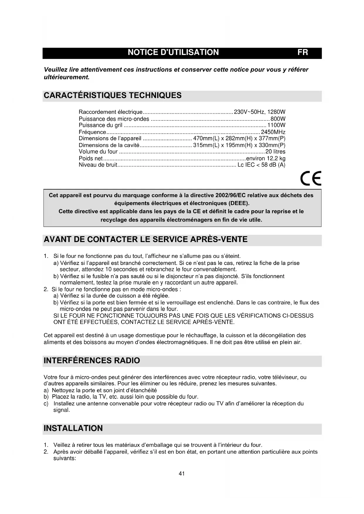 suivants: Cet appareil est pourvu du marquage conforme à la directive 2002/96/EC relative aux déchets des équipements électriques et électroniques (DEEE). Cette directive est applicable dans les pays de la CE et définit le cadre pour la reprise et le recyclage des appareils électroménagers en fin de vie utile.42 - Porte mal alignée - Porte endommagée - Entailles ou trous sur le hublot ou l’afficheur - Bosses ou trous dans la cavité Si vous remarquez l’un des défauts ci-dessus, N’UTILISEZ PAS le four.