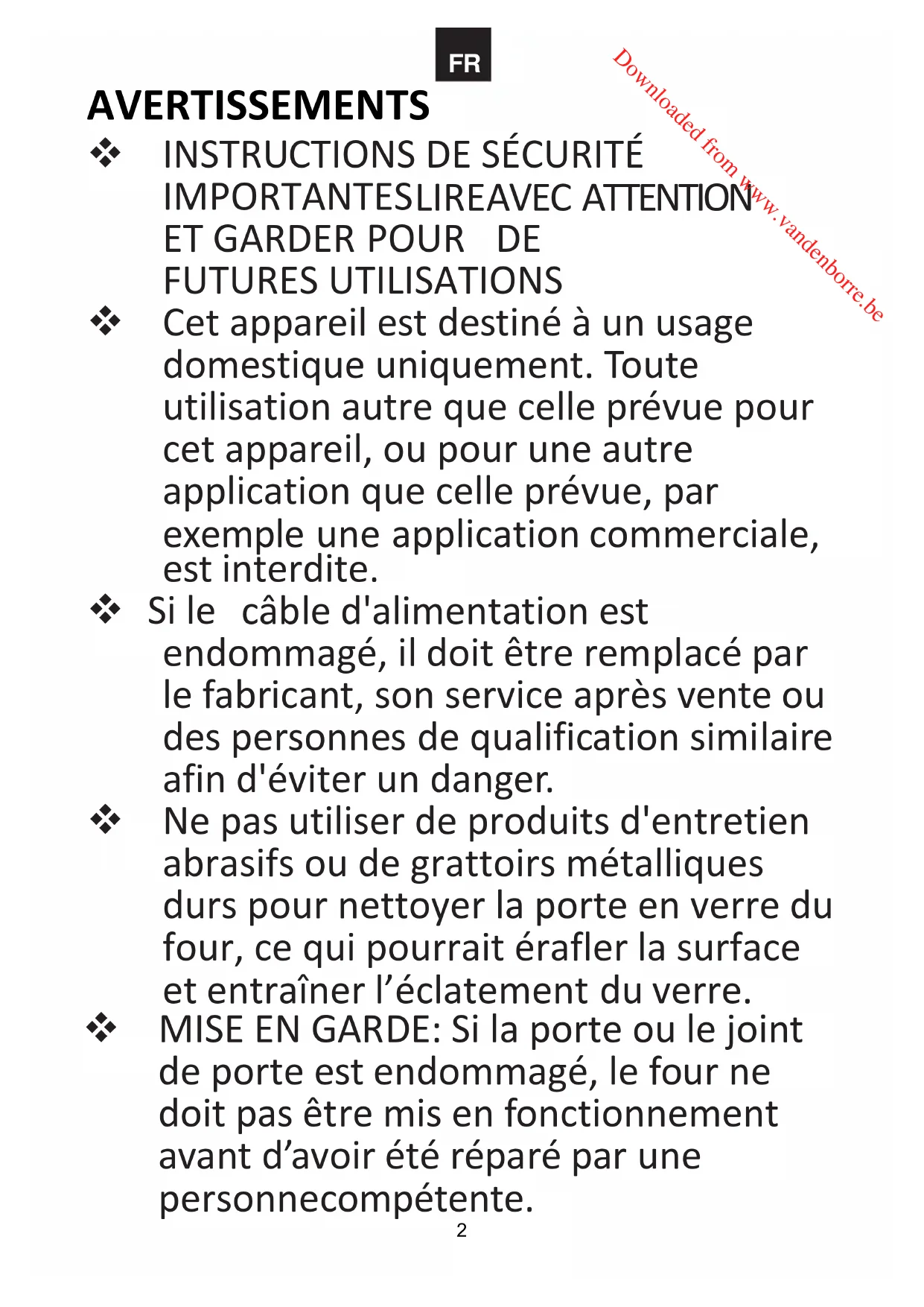Cet appareil peut être ulisé par des enfants âgés d'au moins 8 ans et des personnes dont les capacités physiques, sensorielles ou mentales sont réduites ou souffrant d'un manque d'expérience et de connaissances, à condion qu'elles soient placées sous une surveillance ou qu'elles aient reçu des instrucons quant à l'ulisaon de l'appareil en toute sécurité et en comprennent bien les dangers potenels. Les enfants ne doivent pas uliser l'appareil comme un jouet. Le neoyage et l'entreen de l'ulisateur ne doivent pas être effectués par des enfants, à moins qu'ils ne soient âgés d'au moins 8 ans et qu'ils soient sous la surveillance d'un adulte. Downloaded from www.vandenborre.be2