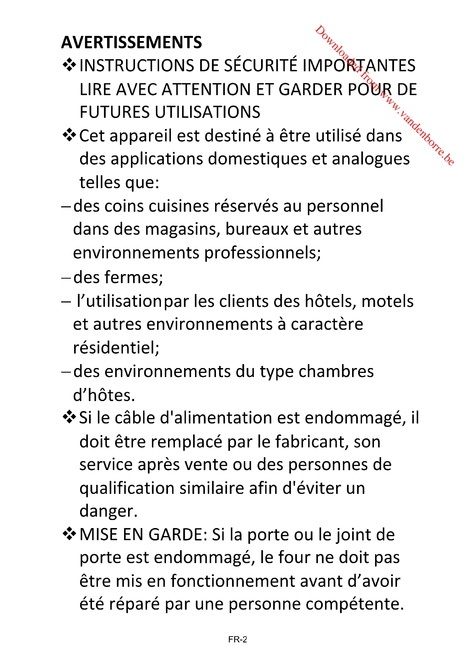 FR-6 Downloaded from www.vandenborre.be Latempératuredessurfacesaccessibles peutêtreélevéelorsquel'appareilesten fonctionnement. Cetappareiln’estpasdestinéàêtremisen fonctionnementaumoyend'uneminuterie extérieureouparunsystèmede commandeàdistanceséparé. Laporteoulasurfaceextérieurepeut devenirchaudelorsquel'appareil