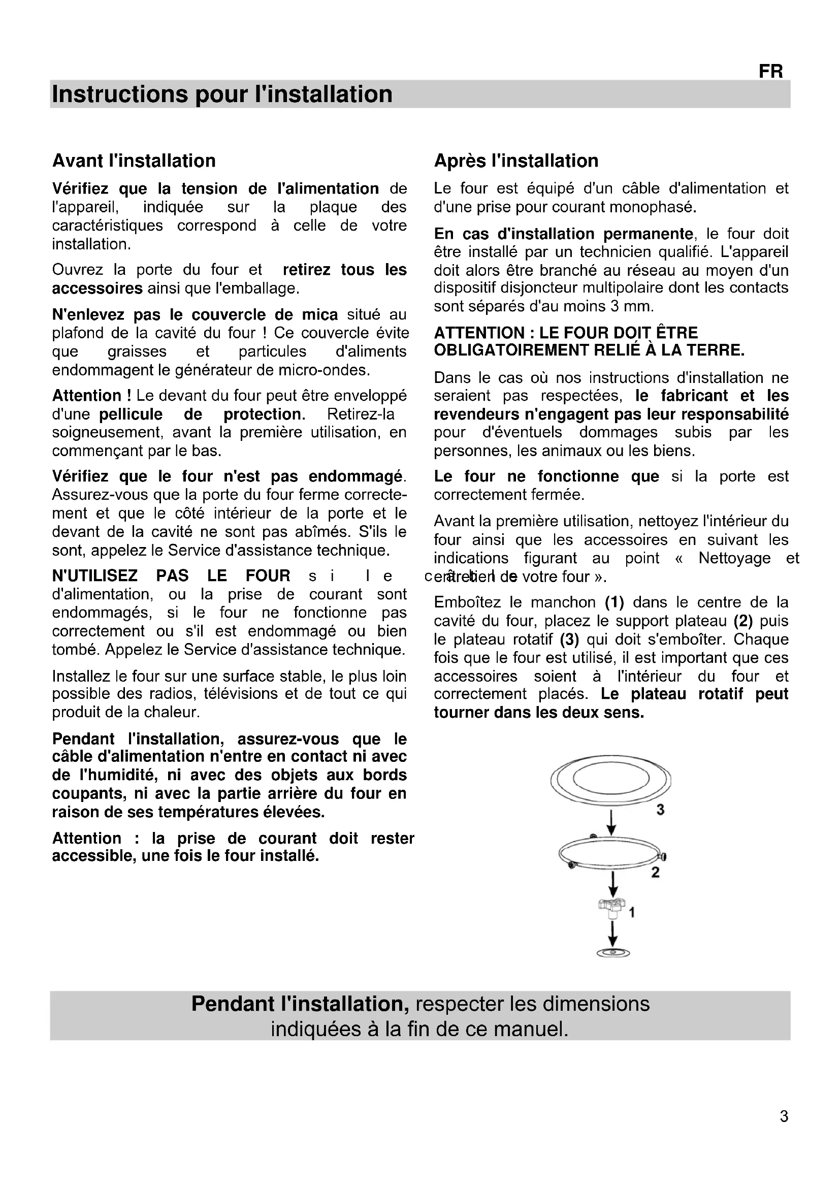 OBLIGATOIREMENT RELIÉ À LA TERRE. Dans le cas où nos instructions d'installation ne seraient pas respectées, le fabricant et les revendeurs n'engagent pas leur responsabilité pour d'éventuels dommages subis par les personnes, les animaux ou les biens. Le four ne fonctionne que si la porte est correctement fermée. Avant la première utilisation, nettoyez l'intérieur du four ainsi que les accessoires en suivant les indications figurant au point « Nettoyage et entretien de votre four ». Emboîtez le manchon (1) dans le centre de la cavité du four, placez le support plateau (2) puis le plateau rotatif (3) qui doit s'emboîter. Chaque fois que le four est utilisé, il est important que ces accessoires soient à l'intérieur du four et correctement placés. Le plateau rotatif peut tourner dans les deux sens.