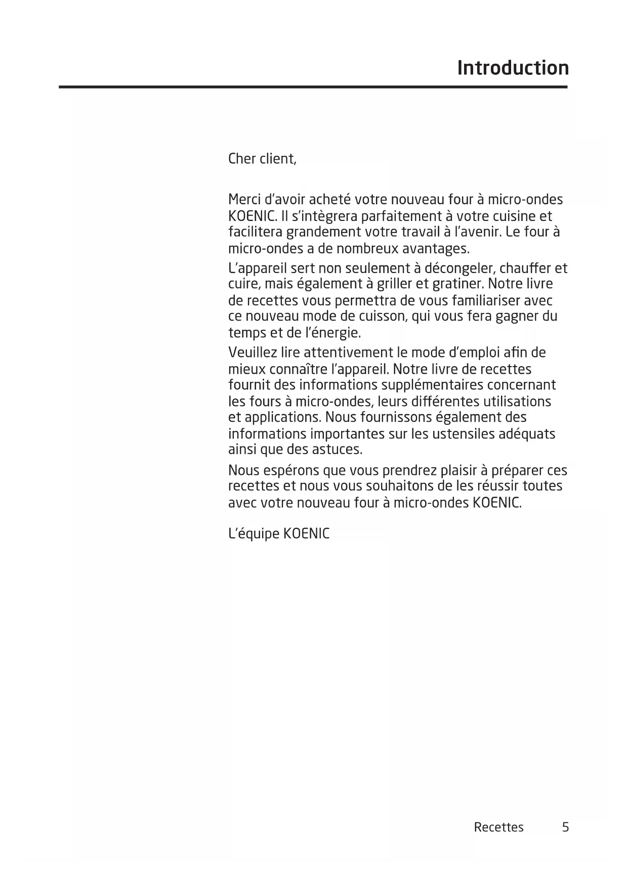 Livre de recettes au four à micro-ondes Gril Apéritifs, hors d‘œuvre et soupes Viande, volaille et poisson Légumes, accompagnements et sauces Sucreries, desserts et boissonsLivre de recettes au four à micro-ondes 2 en 1Impression : Imtron GmbH, Ingolstadt Recettes, textes, composition, disposition : Dipl.oec.troph. Claudia Rauh, Fürth 2Recettes 3 Table des matières Introduction ____________________________________ 5 Informations importantes ________________________6 Récipients _____________________________________9 Tableau des récipients _________________________ 11 Décongélation ________________________________ 12 Chauer _____________________________________ 14 Cuire ________________________________________ 17 Griller _______________________________________ 20 Recettes _____________________________________ 22 Apéritifs, hors d’œuvre et soupes _______________ 23 Viande, volaille et poisson______________________ 29 Légumes, accompagnements et sauces __________ 39 Casseroles et gratins __________________________ 47 Sucreries, desserts et boissons _________________ 53 Liste des recettes _____________________________ 624Recettes 5 Introduction Cher client, Merci d’avoir acheté votre nouveau four à micro-ondes KOENIC. Il s’intègrera parfaitement à votre cuisine et facilitera grandement votre travail à l’avenir. Le four à micro-ondes a de nombreux avantages. L’appareil sert non seulement à décongeler, chauer et cuire, mais également à griller et gratiner. Notre livre de recettes vous permettra de vous familiariser avec ce nouveau mode de cuisson, qui vous fera gagner du temps et de l’énergie. Veuillez lire attentivement le mode d’emploi afin de mieux connaître l’appareil. Notre livre de recettes fournit des informations supplémentaires concernant les fours à micro-ondes, leurs diérentes utilisations et applications. Nous fournissons également des informations importantes sur les ustensiles adéquats ainsi que des astuces. Nous espérons que vous prendrez plaisir à préparer ces recettes et nous vous souhaitons de les réussir toutes avec votre nouveau four à micro-ondes KOENIC. L’équipe KOENIC6 Introduction Informations importantes } Qu’est-ce qu’un four à micro-ondes ? Les micro-ondes sont des ondes électromagnétiques, similaires aux ondes radio et aux ondes de télévision. Leur puissance de cuisson vient du fait qu’elles font vibrer les composants les plus petits des aliments, en particulier les molécules de graisse et d’eau, ainsi les molécules se frottent entre elles. Ces frottements génèrent une chaleur si puissante que le plat est cuit en très peu de temps. Les micro-ondes sont générées dans le magnétron, le cœur de tout four à micro-ondes, un tube à haute fréquence qui émet des ondes. Les micro-ondes sont envoyées dans l’espace de cuisson via une conduite métallique, où elles sont réparties uniformément sur le plat à cuire grâce à un plateau tournant. } Quelles sont les propriétés des micro-ondes ? Les micro-ondes se déplacent en ligne droite dans l’espace. Elles traversent en restant intactes les matériaux tels que le verre, la porcelaine, la céramique, le plastique et le papier, et elles peuvent être reçues par les aliments, c.-à-d. qu’elles peuvent agir directement sur les aliments. Il est inutile de préchauer le plateau tournant. Les micro-ondes se réfléchissent sur les surfaces métalliques. Cela signifie que le métal ne laisse pas passer les micro-ondes. } Les micro-ondes sont-elles dangereuses ? Les micro-ondes sont des ondes relativement longues, qui sont utilisées depuis des décennies pour le traitement thermique médical. Le boîtier métallique empêche les micro- ondes de sortir à l’extérieur de l’appareil, donc tant que la porte est fermée, elles ne quittent pas l’espace de cuisson. Un système à double sécurité éteint le four à micro-ondes dès que la porte de l’appareil est ouverte. Les études scientifiques les plus poussées et approfondies et des décennies d’observation n’ont démontré aucune modification apportée aux aliments par les fours à micro- ondes ayant des eets délétères sur la santé. Au contraire : si le four à micro-ondes est correctement utilisé, il peut apporter une contribution précieuse à une nutrition saine. Les fours à micro-ondes sont soumis à un certain nombre de réglementations et tests. Les fours à micro-ondes KOENIC sont testés et inspectés par des instituts de test agréés. } Comment le four à micro-ondes se règle-t-il ? Comme pour les autres appareils électriques et les plaques de cuisson, vous pouvez sélectionner une durée de fonctionnement et diérents niveaux de puissance sur le four à micro-ondes. Un minuteur ou une horloge électronique éteint l’appareil automatiquement dès que la durée de cuisson s’est écoulée. Contrairement aux méthodes de cuisson conventionnelles, le réglage de la puissance et de la durée joue un rôle plus important, car les micro-ondes chauent directement les aliments. Ainsi, la sélection du réglage correct de puissance et de durée est la clé de bons résultats de cuisson ou de décongélation.Introduction 7 Informations importantes } Réglage de puissance Le réglage de puissance peut être indiqué par des chires, des symboles, des pourcentages ou des puissances en watts. Voici la classification de puissance pour les recettes : “maximum – fort – moyen – faible” qui s’est avérée ecace. Le tableau suivant donne des exemples d’application pour le réglage de puissance individuel que vous pouvez allouer à votre appareil. Les puissances en watts et les valeurs en pourcentage correspondantes figurent sur les plateaux repas ou dans d’autres livres de recettes. Puissance % Watt Exemples d’application Maximum 100 % 80 %