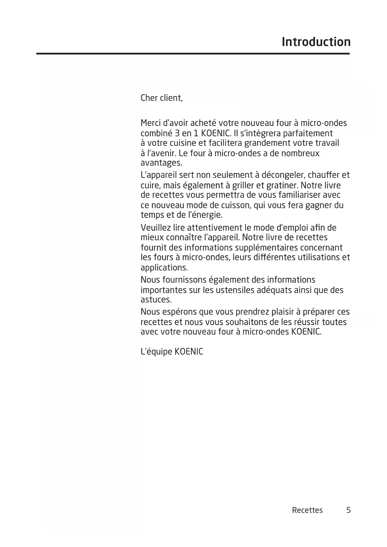 Livre de recettes au four à micro-ondes Convection Apéritifs, hors d‘œuvre et soupes Viande, volaille et poisson Légumes, accompagnements et sauces Sucreries, desserts et boissonsLivre de recettes au four à micro-ondes 3 en 1Impression : Imtron GmbH, Ingolstadt Recettes, textes, composition, disposition : Dipl.oec.troph. Claudia Rauh, Fürth 2Recettes 3 Table des matières Introduction ____________________________________ 5 Informations importantes ________________________6 Récipients _____________________________________9 Tableau des récipients _________________________ 11 Décongélation ________________________________ 12 Chauer _____________________________________ 14 Cuisiner _____________________________________ 17 Griller _______________________________________ 20 Cuire ________________________________________ 22 Rôtir ________________________________________ 24 Recettes _____________________________________ 26 Apéritifs, hors d’œuvre et soupes _______________ 27 Viande, volaille et poisson______________________ 33 Légumes, accompagnements et sauces __________ 45 Casseroles et gratins __________________________ 53 Gâteaux et biscuits ___________________________ 59 Sucreries, desserts et boissons _________________ 67 Liste des recettes _____________________________ 764Recettes 5 Introduction Cher client, Merci d’avoir acheté votre nouveau four à micro-ondes combiné 3 en 1 KOENIC. Il s’intègrera parfaitement à votre cuisine et facilitera grandement votre travail à l’avenir. Le four à micro-ondes a de nombreux avantages. L’appareil sert non seulement à décongeler, chauer et cuire, mais également à griller et gratiner. Notre livre de recettes vous permettra de vous familiariser avec ce nouveau mode de cuisson, qui vous fera gagner du temps et de l’énergie. Veuillez lire attentivement le mode d’emploi afin de mieux connaître l’appareil. Notre livre de recettes fournit des informations supplémentaires concernant les fours à micro-ondes, leurs diérentes utilisations et applications. Nous fournissons également des informations importantes sur les ustensiles adéquats ainsi que des astuces. Nous espérons que vous prendrez plaisir à préparer ces recettes et nous vous souhaitons de les réussir toutes avec votre nouveau four à micro-ondes KOENIC. L’équipe KOENIC6 Introduction Informations importantes } Que signifie 3 en 1 ou four à micro-ondes avec gril et chaleur tournante ? Un four à micro-ondes 3 en 1 est un four à micro-ondes combiné avec gril et chaleur tournante. Il a 3 fonctions et s’appelle également four à micro-ondes combiné. Selon le type d’appareil, les systèmes de chauage peuvent fonctionner individuellement (indépendamment), successivement ou en même temps (fonctionnement combiné). Ceci permet de rapidement cuire et dorer des aliments en même temps. La température et les réglages des micro-ondes peuvent être sélectionnés manuellement ou présélectionnés. Le mode d’emploi vous fournit toute les informations nécessaires sur le fonctionnement de l’appareil. } Que signifie chaleur tournante ? Le terme “chaleur tournante” se rapporte à la manière dont l’air chaud est réparti uniformément à l’intérieur du four grâce à un ventilateur. La chaleur générée par un ou plusieurs éléments chauants circule uniformément en convection autour des aliments et les cuit de tous les côtés. La convection est particulièrement utile pour rendre le plat croustillant et pour cuire avec des résultats similaires à ceux obtenus avec un four classique. De manière générale, la température est comprise entre 150 et 240 °C. Les aliments à cuire ou rôtir peuvent généralement être placés sur la grille inférieure. La plaque rotative tourne afin de dorer encore plus uniformément. } Qu’est-ce qu’il se passe quand un plat grille ? En mode gril, la chaleur des éléments chauants en haut de l’appareil dorent la surface du plat. Avec la chaleur tournante activée, le ventilateur augmente la vitesse du transfert de chaleur. L’intensité du gril peut être régulée en plaçant le plat sur une grille plus haute ou plus basse. La plaque tournante absorbe tout jus qui goutte et aide à dorer plus uniformément le plat qui grille. } Que signifient cuisson combinée et appareil combiné ? La cuisson combinée consiste à combiner l’utilisation de la chaleur tournante, du gril et des micro-ondes. Les quatre réglages suivants de réglages combinés sont souvent programmés : Combinaison 1 - Chaleur tournante + micro-ondes Combinaison 2 - Gril + micro-ondes Combinaison 3 - Gril + chaleur tournante (griller en chaleur tournante) Combinaison 4 - Chaleur tournante + gril + micro-ondes La chaleur tournante permet de dorer les aliments de tous les côtés grâce à la régulation de température, le gril permet de griller intensément la surface du plat, et si les micro-ondes sont activées, le plat sera cuit un tiers du temps. La cuisson combinée est idéale pour cuire rapidement et dorer uniformément la viande et la volaille. Elle convient également pour gratiner et cuire en même temps des soués et des gratins. Pendant que les micro-ondes cuisent le plat, la chaleur tournante ou la fonction de gril dorent le plat pour le rendre croustillant.Introduction 7 Informations importantes } Que sont les micro-ondes ? Les micro-ondes sont des ondes électromagnétiques, similaires aux ondes radio et aux ondes de télévision. Leur puissance de cuisson vient du fait qu’elles font vibrer les composants les plus petits des aliments, en particulier les molécules de graisse et d’eau, ainsi les molécules se frottent entre elles. Ces frottements génèrent une chaleur si puissante que le plat est cuit en très peu de temps. Les micro-ondes sont générées dans le magnétron, le cœur de tout four à micro-ondes, un tube à haute fréquence qui émet des ondes. Les micro-ondes sont envoyées dans l’espac