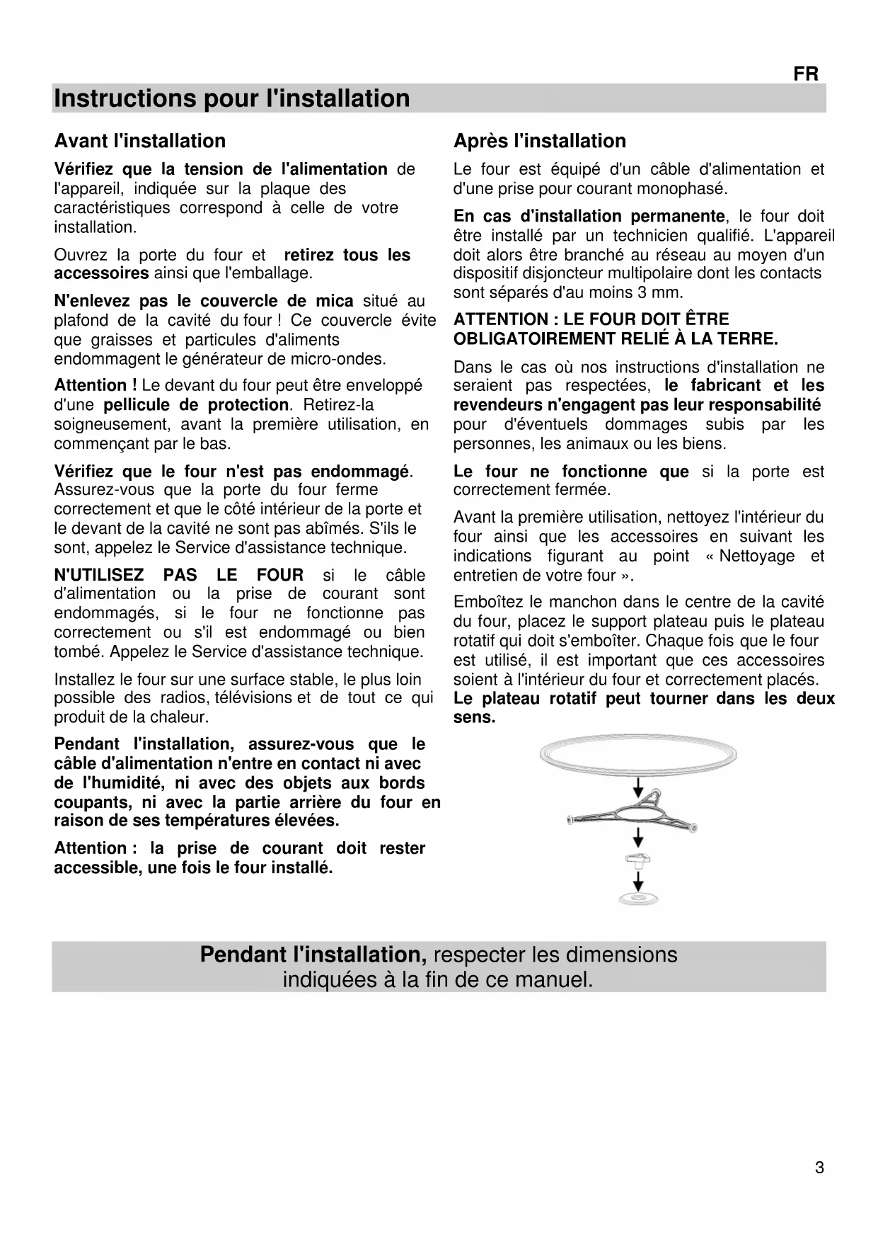 OBLIGATOIREMENT RELIÉ À LA TERRE. Dans le cas où nos instructions d'installation ne seraient pas respectées, le fabricant et les revendeurs n'engagent pas leur responsabilité pour d'éventuels dommages subis par les personnes, les animaux ou les biens. Le four ne fonctionne que si la porte est correctement fermée. Avant la première utilisation, nettoyez l'intérieur du four ainsi que les accessoires en suivant les indications figurant au point « Nettoyage et entretien de votre four ». Emboîtez le manchon dans le centre de la cavité du four, placez le support plateau puis le plateau rotatif qui doit s'emboîter. Chaque fois que le four est utilisé, il est important que ces accessoires soient à l'intérieur du four et correctement placés. Le plateau rotatif peut tourner dans les deux sens.