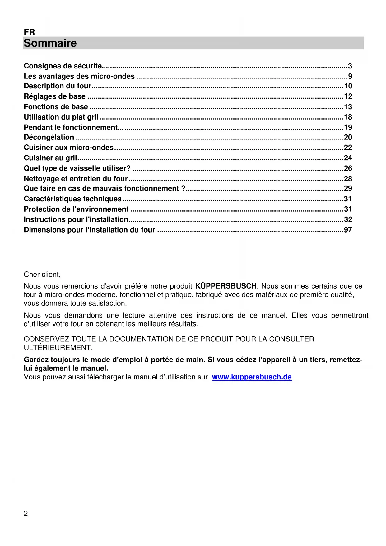 Cher client, Nous vous remercions d'avoir préféré notre produit KÜPPERSBUSCH. Nous sommes certains que ce four à micro-ondes moderne, fonctionnel et pratique, fabriqué avec des matériaux de première qualité, vous donnera toute satisfaction. Nous vous demandons une lecture attentive des instructions de ce manuel. Elles vous permettront d'utiliser votre four en obtenant les meilleurs résultats. CONSERVEZ TOUTE LA DOCUMENTATION DE CE PRODUIT POUR LA CONSULTER ULTÉRIEUREMENT. Gardez toujours le mode d’emploi à portée de main. Si vous cédez l'appareil à un tiers, remettez- lui également le manuel. Vous pouvez aussi télécharger le manuel d’utilisation sur www.kuppersbusch.de3