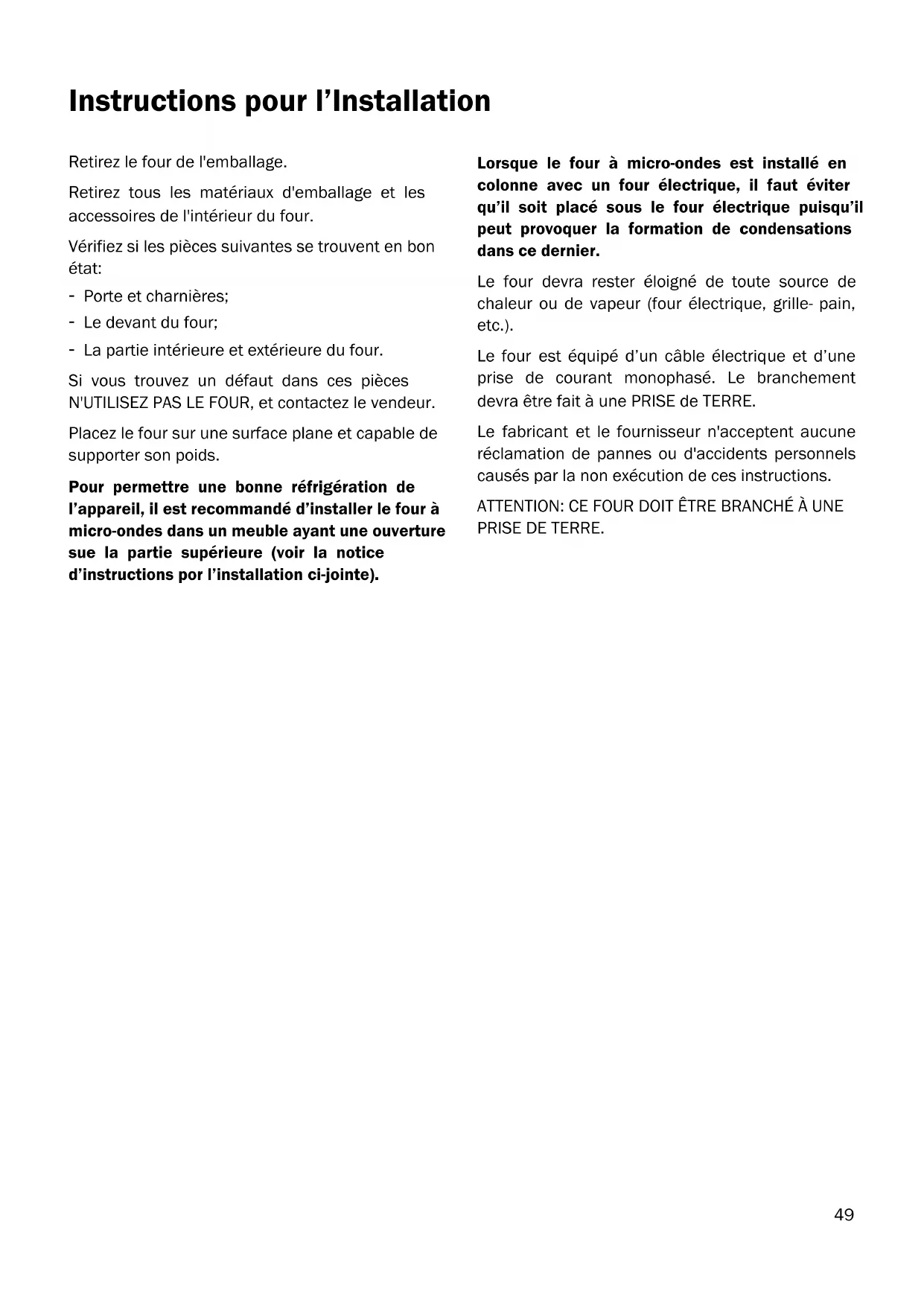 Instructions pour l’Installation Retirez le four de l'emballage. Retirez tous les matériaux d'emballage et les accessoires de l'intérieur du four. Vérifiez si les pièces suivantes se trouvent en bon état: - Porte et charnières; - Le devant du four; - La partie intérieure et extérieure du four. Si vous trouvez un défaut dans ces pièces N'UTILISEZ PAS LE FOUR, et contactez le vendeur. Placez le four sur une surface plane et capable de supporter son poids. Pour permettre une bonne réfrigération de l’appareil, il est recommandé d’installer le four à micro-ondes dans un meuble ayant une ouverture sue la partie supérieure (voir la notice d’instructions por l’installation ci-jointe). Lorsque le four à micro-ondes est installé en colonne avec un four électrique, il faut éviter qu’il soit placé sous le four électrique puisqu’il peut provoquer la formation de condensations dans ce dernier. Le four devra rester éloigné de toute source de chaleur ou de vapeur (four électrique, grille- pain, etc.). Le four est équipé d’un câble électrique et d’une prise de courant monophasé. Le branchement devra être fait à une PRISE de TERRE. Le fabricant et le fournisseur n'acceptent aucune réclamation de pannes ou d'accidents personnels causés par la non exécution de ces instructions. ATTENTION: CE FOUR DOIT ÊTRE BRANCHÉ À UNE