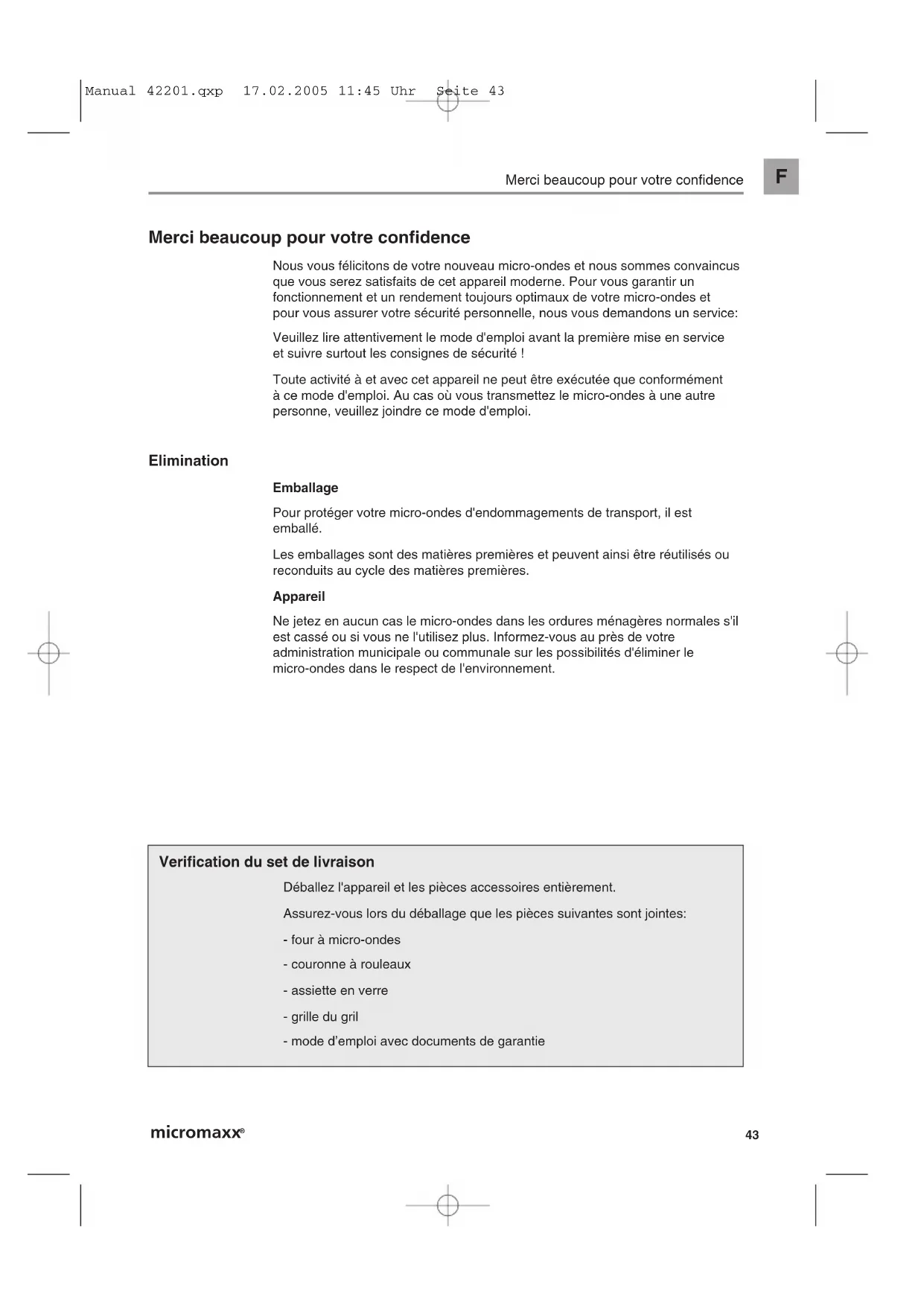 Merci beaucoup pour votre confidence Nous vous félicitons de votre nouveau micro-ondes et nous sommes convaincusque vous serez satisfaits de cet appareil moderne. Pour vous garantir un fonctionnement et un rendement toujours optimaux de votre micro-ondes et pour vous assurer votre sécurité personnelle, nous vous demandons un service:Veuillez lire attentivement le mode d'emploi avant la première mise en service et suivre surtout les consignes de sécurité !Toute activité à et avec cet appareil ne peut être exécutée que conformément à ce mode d'emploi. Au cas où vous transmettez le micro-ondes à une autre personne, veuillez joindre ce mode d'emploi. Elimination EmballagePour protéger votre micro-ondes d'endommagements de transport, il est emballé.Les emballages sont des matières premières et peuvent ainsi être réutilisés oureconduits au cycle des matières premières.AppareilNe jetez en aucun cas le micro-ondes dans les ordures ménagères normales s'ilest cassé ou si vous ne l'utilisez plus. Informez-vous au près de votre administration municipale ou communale sur les possibilités d'éliminer le micro-ondes dans le respect de l'environnement. Verification du set de livraison Déballez l'appareil et les pièces accessoires entièrement.Assurez-vous lors du déballage que les pièces suivantes sont jointes:- four à micro-ondes- couronne à rouleaux- assiette en verre- grille du gril- mode d’emploi avec documents de garantie Manual 42201.qxp 17.02.2005 11:45 Uhr Seite 43Consignes de sécurité