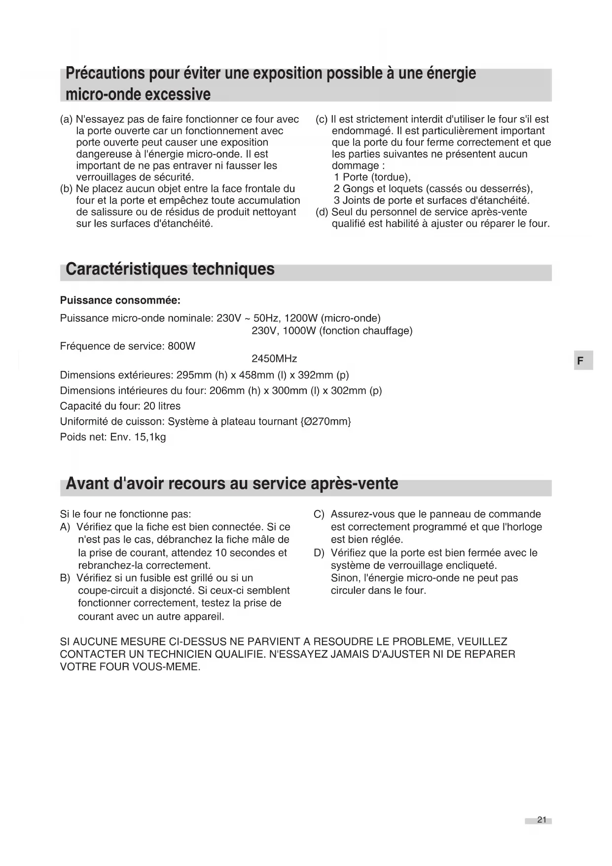 (a) N'essayez pas de faire fonctionner ce four avec la porte ouverte car un fonctionnement avec porte ouverte peut causer une exposition dangereuse à l'énergie micro-onde. Il est important de ne pas entraver ni fausser les verrouillages de sécurité. (b) Ne placez aucun objet entre la face frontale du four et la porte et empêchez toute accumulation de salissure ou de résidus de produit nettoyant sur les surfaces d'étanchéité. (c) Il est strictement interdit d'utiliser le four s'il est endommagé. Il est particulièrement important que la porte du four ferme correctement et que les parties suivantes ne présentent aucun dommage : 1 Porte (tordue), 2 Gongs et loquets (cassés ou desserrés), 3 Joints de porte et surfaces d'étanchéité. (d) Seul du personnel de service après-vente qualifié est habilité à ajuster ou réparer le four. Puissance consommée: Puissance micro-onde nominale: 230V ~ 50Hz, 1200W (micro-onde) 230V, 1000W (fonction chauffage) Fréquence de service: 800W 2450MHz Dimensions extérieures: 295mm (h) x 458mm (l) x 392mm (p) Dimensions intérieures du four: 206mm (h) x 300mm (l) x 302mm (p) Capacité du four: 20 litres Uniformité de cuisson: Système à plateau tournant {Ø270mm} Poids net: Env. 15,1kg SI AUCUNE MESURE CI-DESSUS NE PARVIENT A RESOUDRE LE PROBLEME, VEUILLEZ CONTACTER UN TECHNICIEN QUALIFIE. N'ESSAYEZ JAMAIS D'AJUSTER NI DE REPARER VOTRE FOUR VOUS-MEME. Précautions pour éviter une exposition possible à une énergie micro-onde excessive Caractéristiques techniques Avant d'avoir recours au service après-vente Si le four ne fonctionne pas: A) Vérifiez que la fiche est bien connectée. Si ce n'est pas le cas, débranchez la fiche mâle de la prise de courant, attendez 10 secondes et rebranchez-la correctement. B) Vérifiez si un fusible est grillé ou si un coupe-circuit a disjoncté. Si ceux-ci semblent fonctionner correctement, testez la prise de courant avec un autre appareil. C) Assurez-vous que le panneau de commande est correctement programmé et que l'horloge est bien réglée. D) Vérifiez que la porte est bien fermée avec le système de verrouillage encliqueté. Sinon, l'énergie micro-onde ne peut pas circuler dans le four. Manual 41568_Multi 02.04.2004 13:02 Uhr Seite 21F