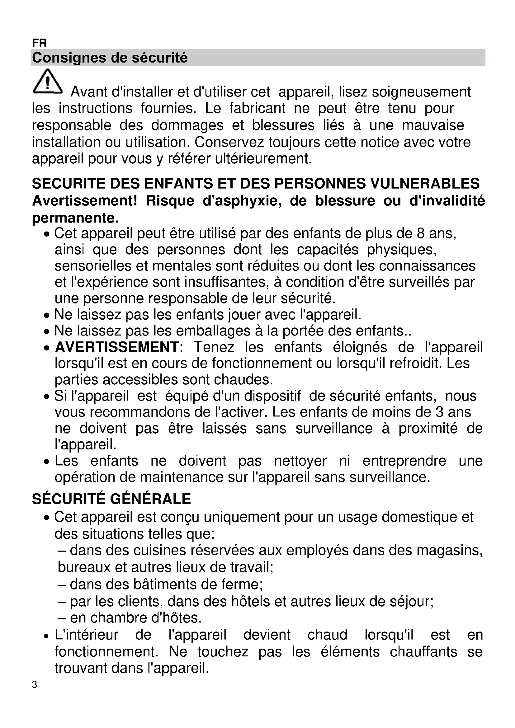 Consignes de sécurité Avant d'installer et d'utiliser cet appareil, lisez soigneusement les instructions fournies. Le fabricant ne peut être tenu pour responsable des dommages et blessures liés à une mauvaise installation ou utilisation. Conservez toujours cette notice avec votre appareil pour vous y référer ultérieurement. SECURITE DES ENFANTS ET DES PERSONNES VULNERABLES Avertissement! Risque d'asphyxie, de blessure ou d'invalidité permanente. Cet appareil peut être utilisé par des enfants de plus de 8 ans, ainsi que des personnes dont les capacités physiques, sensorielles et mentales sont réduites ou dont les connaissances et l'expérience sont insuffisantes, à condition d'être surveillés par une personne responsable de leur sécurité. Ne laissez pas les enfants jouer avec l'appareil. Ne laissez pas les emballages à la portée des enfants..