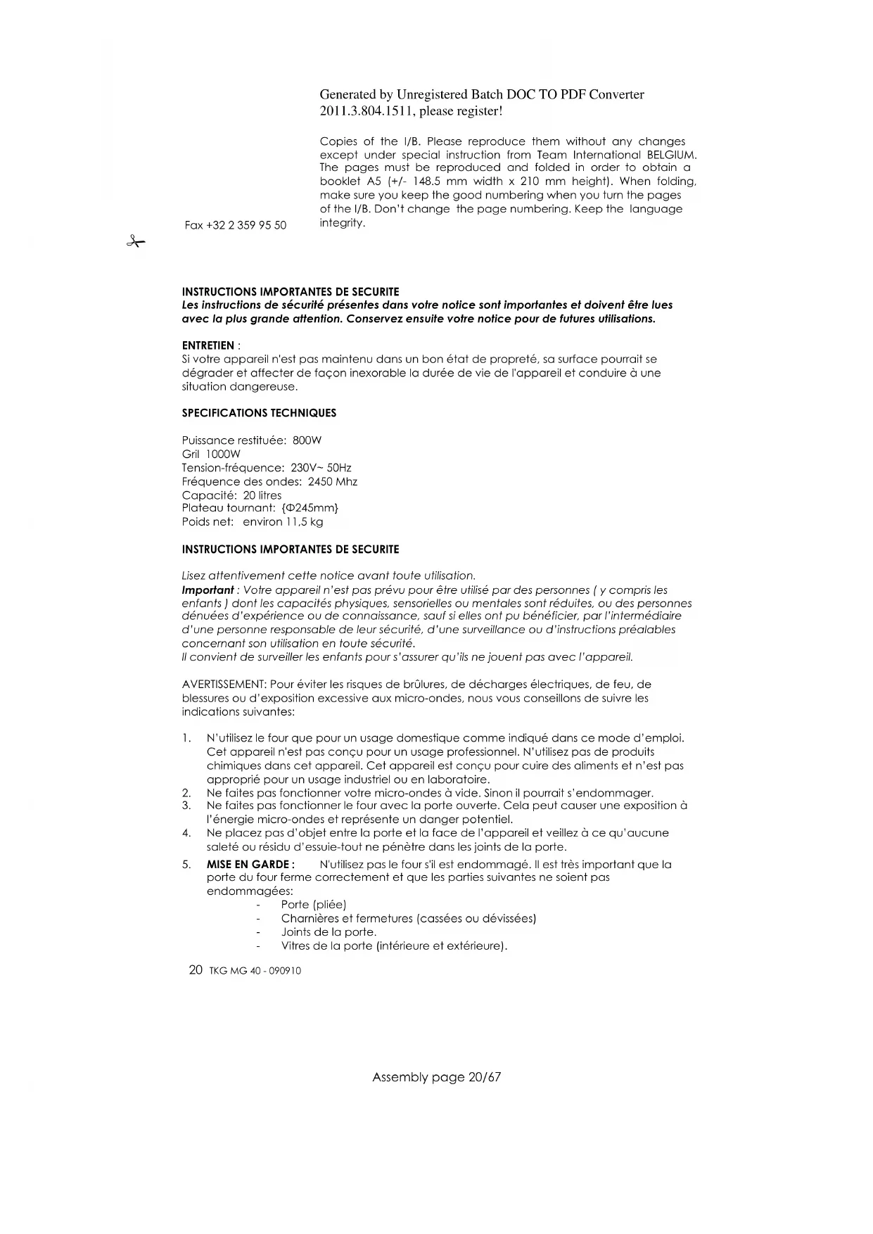 Afin de préserver notre environnement et notre santé, l‟élimination en fin de vie des appareils électriques et électroniques doit se faire selon des règles bien précises et nécessite l‟implication de chacun, qu‟il soit fournisseur ou utilisateur. C‟est pour cette raison que votre appareil, tel que le signale le symbole apposé sur sa plaque signalétique ou sur l'emballage, ne doit en aucun cas être jeté dans une poubelle publique ou privée destinée aux ordures ménagères. L'utilisateur a le droit de déposer l'appareil dans des lieux publics de collecte procédant à un tri sélectif des déchets pour être soit recyclé, soit réutilisé pour d‟autres applications conformément à la directive.Generated by Unregistered Batch DOC TO PDF Converter 2011.3.804.1511, please register! Copies of the I/B. Please reproduce them without any changes except under special instruction from Team International BELGIUM. The pages must be reproduced and folded in order to obtain a booklet A5 (+/- 148.5 mm width x 210 mm height). When folding, make sure you keep the good numbering when you turn the pages of the I/B. Don‟t change the page numbering. Keep the language integrity.