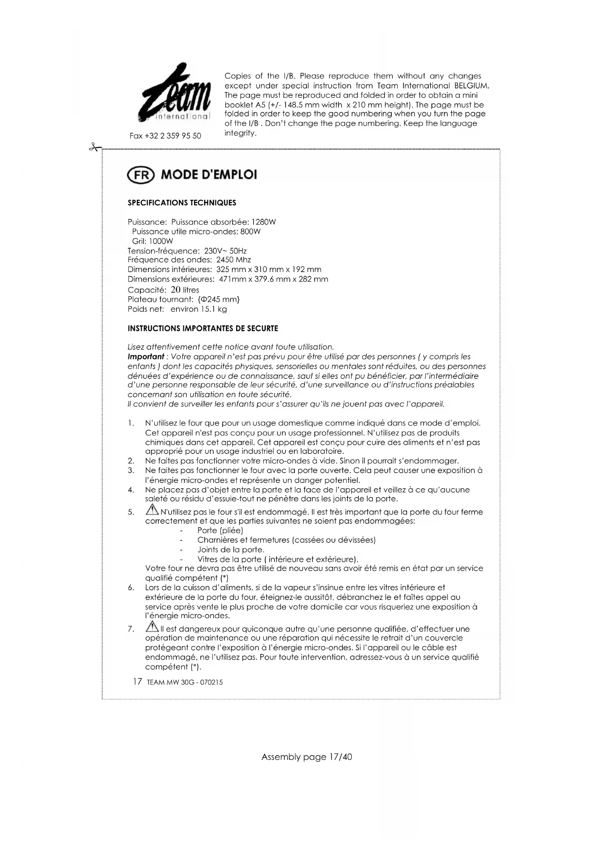 MODE D'EMPLOI MW 30 TEAM