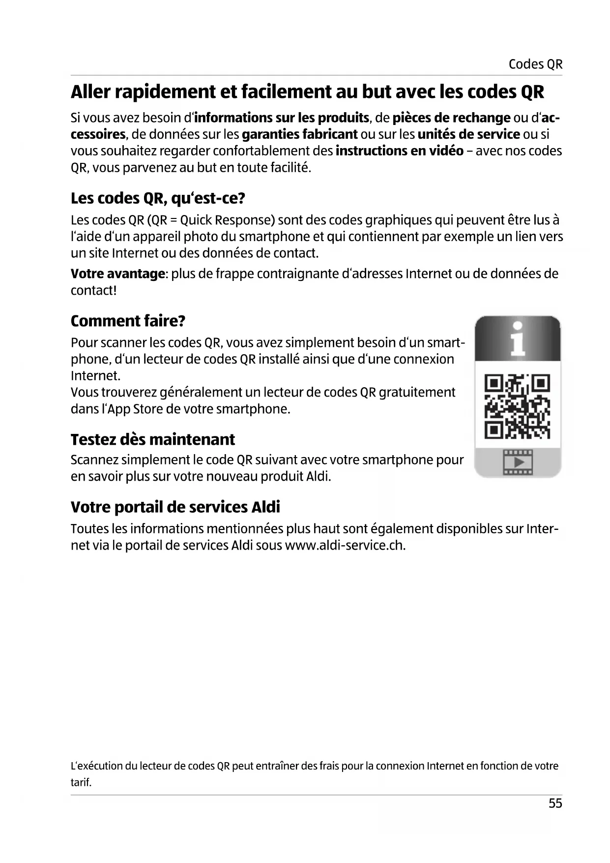 - Mentions légales 5 Codes QR Aller rapidement et facilement au but avec les codes QR Si vous avez besoin d‘informations sur les produits, de pièces de rechange ou d‘ac- cessoires, de données sur les garanties fabricant ou sur les unités de service ou si vous souhaitez regarder confortablement des instructions en vidéo – avec nos codes QR, vous parvenez au but en toute facilité. Les codes QR, qu‘est-ce? Les codes QR (QR = Quick Response) sont des codes graphiques qui peuvent être lus à l‘aide d‘un appareil photo du smartphone et qui contiennent par exemple un lien vers un site Internet ou des données de contact. Votre avantage: plus de frappe contraignante d‘adresses Internet ou de données de contact! Comment faire? Pour scanner les codes QR, vous avez simplement besoin d‘un smart- phone, d‘un lecteur de codes QR installé ainsi que d‘une connexion Internet. Vous trouverez généralement un lecteur de codes QR gratuitement dans l‘App Store de votre smartphone. Testez dès maintenant Scannez simplement le code QR suivant avec votre smartphone pour en savoir plus sur votre nouveau produit Aldi. Votre portail de services Aldi Toutes les informations mentionnées plus haut sont également disponibles sur Inter- net via le portail de services Aldi sous www.aldi-service.ch. Codes QR L‘exécution du lecteur de codes QR peut entraîner des frais pour la connexion Internet en fonction de votre tarif. p. 1015