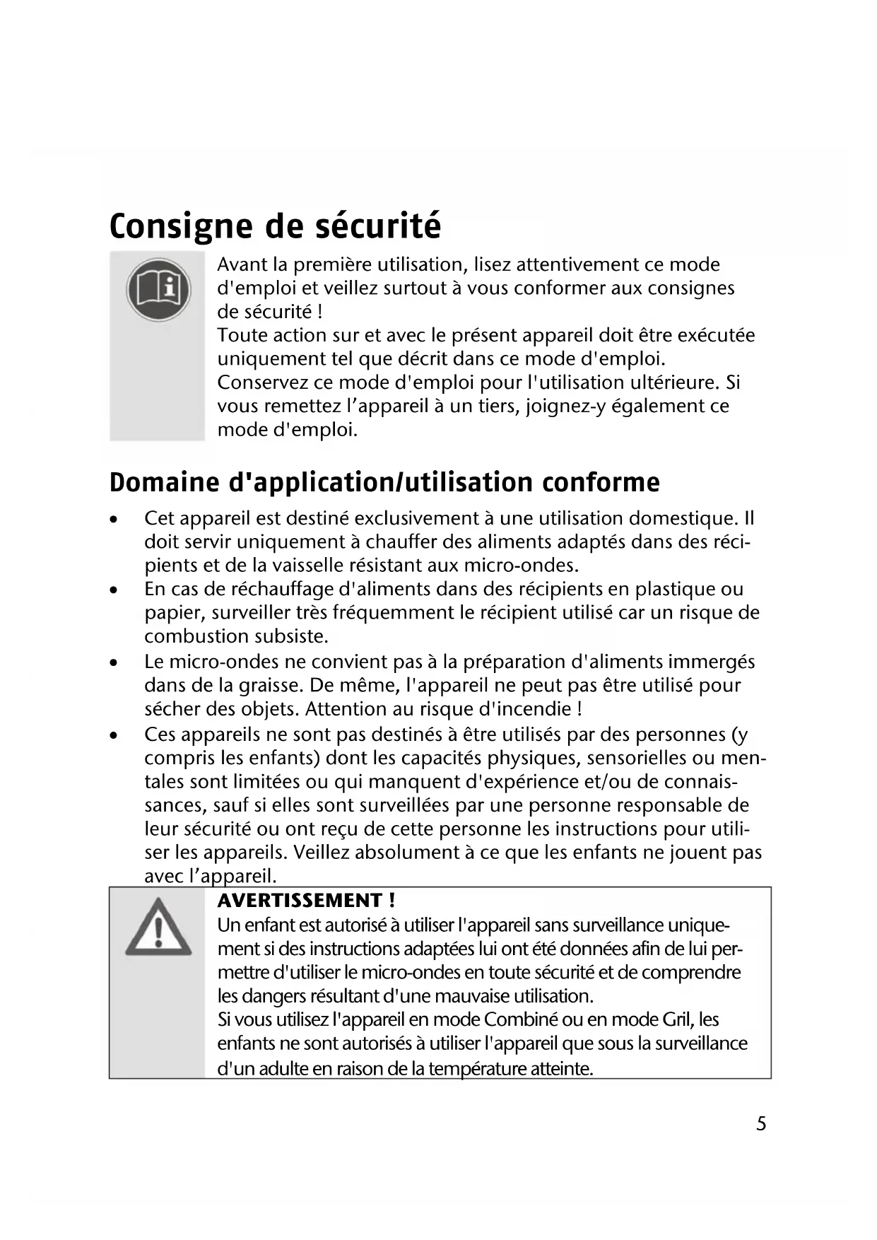 - Caractéristiques techniques Consigne de sécurité Avant la première utilisation, lisez attentivement ce mode d'emploi et veillez surtout à vous conformer aux consignes de sécurité ! Toute action sur et avec le présent appareil doit être exécutée uniquement tel que décrit dans ce mode d'emploi. Conservez ce mode d'emploi pour l'utilisation ultérieure. Si vous remettez l’appareil à un tiers, joignez-y également ce mode d'emploi. Domaine d'application/utilisation conforme Cet appareil est destiné exclusivement à une utilisation domestique. Il doit servir uniquement à chauffer des aliments adaptés dans des réci- pients et de la vaisselle résistant aux micro-ondes. En cas de réchauffage d'aliments dans des récipients en plastique ou papier, surveiller très fréquemment le récipient utilisé car un risque de combustion subsiste. Le micro-ondes ne convient pas à la préparation d'aliments immergés dans de la graisse. De même, l'appareil ne peut pas être utilisé pour sécher des objets. Attention au risque d'incendie ! Ces appareils ne sont pas destinés à être utilisés par des personnes (y compris les enfants) dont les capacités physiques, sensorielles ou men- tales sont limitées ou qui manquent d'expérience et/ou de connais- sances, sauf si elles sont surveillées par une personne responsable de leur sécurité ou ont reçu de cette personne les instructions pour utili- ser les appareils. Veillez absolument à ce que les enfants ne jouent pas avec l’appareil. AVERTISSEMENT ! Un enfant est autorisé à utiliser l'appareil sans surveillance unique- ment si des instructions adaptées lui ont été données afin de lui per- mettre d'utiliser le micro-ondes en toute sécurité et de comprendre les dangers résultant d'une mauvaise utilisation. Si vous utilisez l'appareil en mode Combiné ou en mode Gril, les enfants ne sont autorisés à utiliser l'appareil que sous la surveillance d'un adulte en raison de la température atteinte.6 Installation et branchement électrique Branchez le micro-ondes uniquement à une prise de courant 230-240V~50Hz réglementaire avec une prise terre, dotée d'une pro- tection de 16 ampères minimum. N'utilisez pas de rallonge. Vérifiez que le câble électrique n'est pas endommagé et qu'il ne se trouve pas sous l'appareil, sur une surface chaude ou au niveau d'une arête tranchante. Le micro-ondes doit être installé sur une surface plane et stable, ca- pable de supporter le poids de l'appareil à vide plus le poids maxi- mum des aliments qui y sont préparés. Le micro-ondes doit être instal- lé à un endroit sec protégé. L'appareil doit être posé directement sur une surface plane. Il ne peut pas être encastré. p. 355