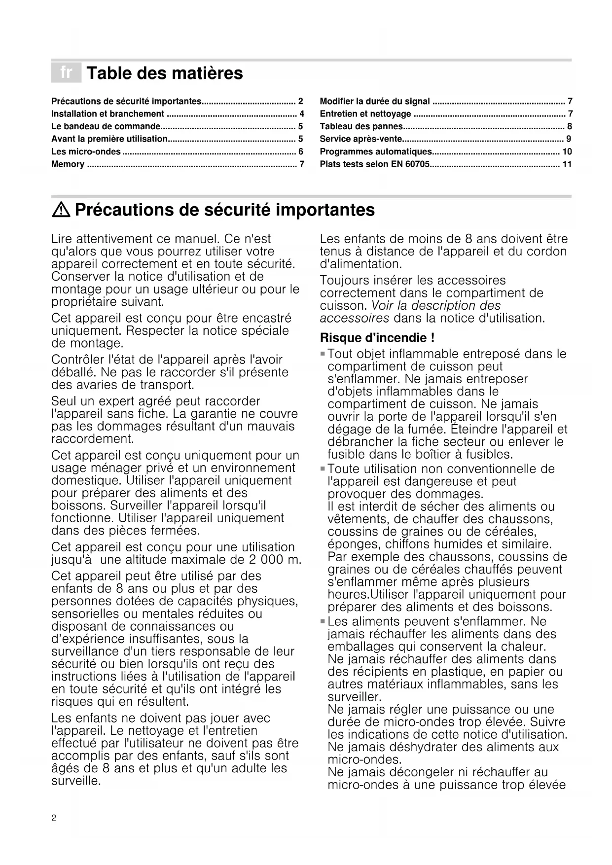 - Plats tests selon EN 60705 : Précautions de sécurité importantes Lire attentivement ce manuel. Ce n'est qu'alors que vous pourrez utiliser votre appareil correctement et en toute sécurité. Conserver la notice d'utilisation et de montage pour un usage ultérieur ou pour le propriétaire suivant. Cet appareil est conçu pour être encastré uniquement. Respecter la notice spéciale de montage. Contrôler l'état de l'appareil après l'avoir déballé. Ne pas le raccorder s'il présente des avaries de transport. Seul un expert agréé peut raccorder l'appareil sans fiche. La garantie ne couvre pas les dommages résultant d'un mauvais raccordement. Cet appareil est conçu uniquement pour un usage ménager privé et un environnement domestique. Utiliser l'appareil uniquement pour préparer des aliments et des boissons. Surveiller l'appareil lorsqu'il fonctionne. Utiliser l'appareil uniquement dans des pièces fermées. Cet appareil est conçu pour une utilisation jusqu'à une altitude maximale de 2 000 m. Cet appareil peut être utilisé par des enfants de 8 ans ou plus et par des personnes dotées de capacités physiques, sensorielles ou mentales réduites ou disposant de connaissances ou d’expérience insuffisantes, sous la surveillance d'un tiers responsable de leur sécurité ou bien lorsqu'ils ont reçu des instructions liées à l'utilisation de l'appareil en toute sécurité et qu'ils ont intégré les risques qui en résultent. Les enfants ne doivent pas jouer avec l'appareil. Le nettoyage et l'entretien effectué par l'utilisateur ne doivent pas être accomplis par des enfants, sauf s'ils sont âgés de 8 ans et plus et qu'un adulte les surveille. Les enfants de moins de 8 ans doivent être tenus à distance de l'appareil et du cordon d'alimentation. Toujours insérer les accessoires correctement dans le compartiment de cuisson. Voir la description des accessoires dans la notice d'utilisation. Risque d'incendie ! p. 11