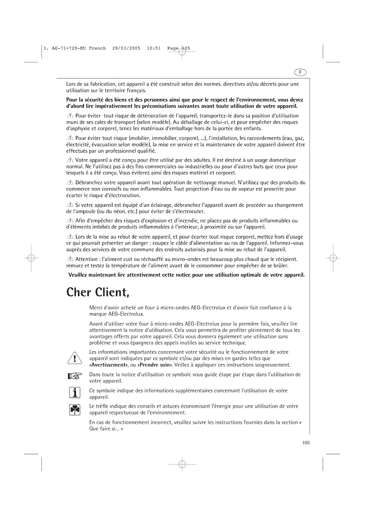 Cher Client, Merci d’avoir acheté un four à micro-ondes AEG-Electrolux et d’avoir fait confiance à la marque AEG-Electrolux. Avant d’utiliser votre four à micro-ondes AEG-Electrolux pour la première fois, veuillez lire attentivement la notice d’utilisation. Cela vous permettra de profiter pleinement de tous les avantages offerts par votre appareil. Cela vous donnera également une utilisation sans problème et vous épargnera des appels inutiles au service technique. Les informations importantes concernant votre sécurité ou le fonctionnement de votre appareil sont indiquées par ce symbole et/ou par des mises en gardes telles que «Avertissement», ou «Prendre soin». Veillez à appliquer ces instructions soigneusement. Dans toute la notice d’utilisation ce symbole vous guide étape par étape dans l’utilisation de votre appareil. Ce symbole indique des informations supplémentaires concernant l’utilisation de votre appareil. Le trèfle indique des conseils et astuces économisant l’énergie pour une utilisation de votre appareil respectueuse de l’environnement. En cas de fonctionnement incorrect, veuillez suivre les instructions fournies dans la section « Que faire si… » Lors de sa fabrication, cet appareil a été construit selon des normes. directives at/ou décrets pour une utilisation sur le territoire français. Pour la sécurité des biens et des personnes ainsi que pour le respect de l’environnement, vous devez d’abord lire impérativement les préconisations suivantes avant toute utilisation de votre appareil. Pour éviter tout risque de détérioration de l’appareil, transportez-le dans sa position d’utilisation muni de ses cales de transport (selon modèle). Au déballage de celui-ci, et pour empêcher des risques d’asphyxie et corporel, tenez les matériaux d’emballage hors de la portée des enfants. Pour éviter tout risque (mobilier, immobilier, corporel, ...), l’installation, les raccordements (eau, gaz, électricité, évacuation selon modèle), la mise en service et la maintenance de votre appareil doivent être effectués par un professionnel qualifié. Votre appareil a été conçu pour être utilisé par des adultes. Il est destiné à un usage domestique normal. Ne l’utilisez pas à des fins commerciales ou industrielles ou pour d’autres buts que ceux pour lesquels il a été conçu. Vous éviterez ainsi des risques matériel et corporel. Débranchez votre appareil avant tout opération de nettoyage manuel. N’utilisez que des produits du commerce non corrosifs ou non inflammables. Tout projection d’eau ou de vapeur est proscrite pour écarter le risque d’électrocution. Si votre appareil est équipé d’un éclairage, débranchez l’appareil avant de procéder au changement de l’ampoule (ou du néon, etc.) pour éviter de s’électrocuter. Afin d’empêcher des risques d’explosion et d’incendie, ne placez pas de produits inflammables ou d’éléments imbibés de produits inflammables à l’intérieur, à proximité ou sur l’appareil. Lors de la mise au rebut de votre appareil, et pour écarter tout risque corporel, mettez hors d’usage ce qui pourrait présenter un danger : coupez le câble d’alimentation au ras de l’appareil. Informez-vous auprès des services de votre commune des endroits autorisés pour la mise au rebut de l’appareil. Attention : l’aliment cuit ou réchauffé au micro-ondes est beaucoup plus chaud que le récipient. remuez et testez la température de l’aliment avant de le consommer pour empêcher de se brûler. Veuillez maintenant lire attentivement cette notice pour une utilisation optimale de votre appareil.