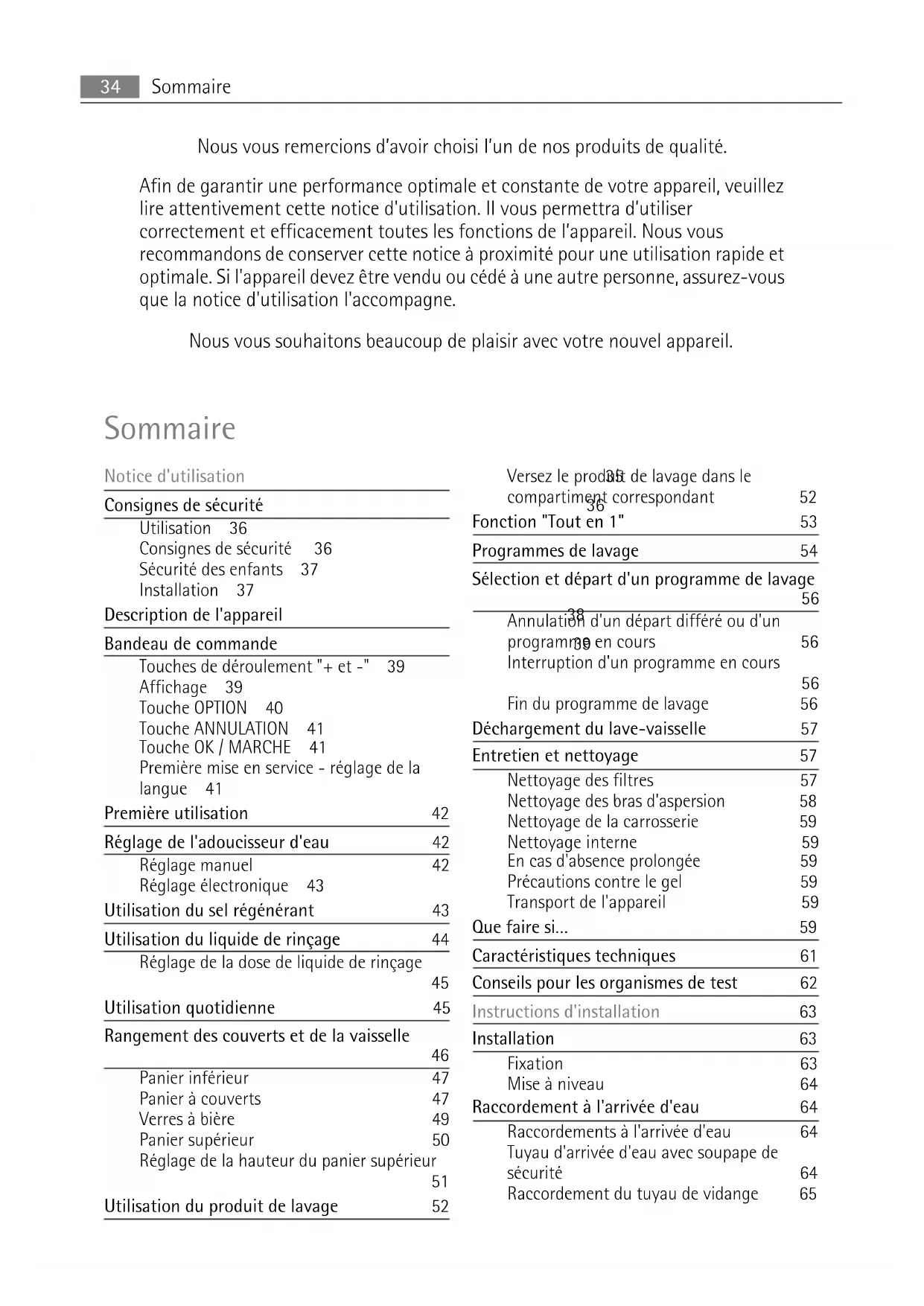 - Verwijder het slot van de deur. Zo voorkomt u dat kinderen zichzelf insluiten en hun leven in gevaar brengen. Aansluiting aan het elektriciteitsnet 33Nous vous remercions d’avoir choisi l’un de nos produits de qualité. Afin de garantir une performance optimale et constante de votre appareil, veuillez lire attentivement cette notice d'utilisation. Il vous permettra d’utiliser correctement et efficacement toutes les fonctions de l’appareil. Nous vous recommandons de conserver cette notice à proximité pour une utilisation rapide et optimale. Si l'appareil devez être vendu ou cédé à une autre personne, assurez-vous que la notice d'utilisation l'accompagne. Nous vous souhaitons beaucoup de plaisir avec votre nouvel appareil. Sommaire Notice d'utilisation 35 Consignes de sécurité 36 Utilisation 36 Consignes de sécurité 36 Sécurité des enfants 37 Installation 37 Description de l'appareil 38 Bandeau de commande 39 Touches de déroulement "+ et -" 39 Affichage 39 Touche OPTION 40 Touche ANNULATION 41 Touche OK / MARCHE 41 Première mise en service - réglage de la langue 41 Première utilisation 42 Réglage de l'adoucisseur d'eau 42 Réglage manuel 42 Réglage électronique 43 Utilisation du sel régénérant 43 Utilisation du liquide de rinçage 44 Réglage de la dose de liquide de rinçage