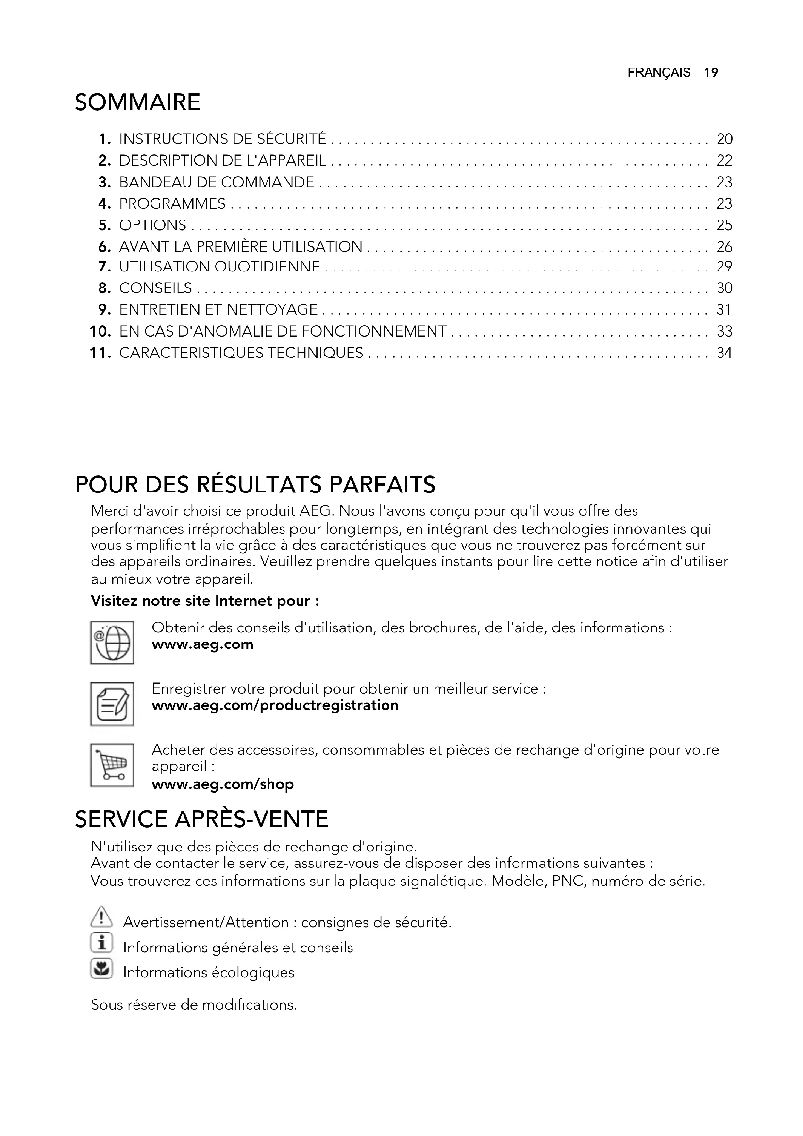 Merci d'avoir choisi ce produit AEG. Nous l'avons conçu pour qu'il vous offre des performances irréprochables pour longtemps, en intégrant des technologies innovantes qui vous simplifient la vie grâce à des caractéristiques que vous ne trouverez pas forcément sur des appareils ordinaires. Veuillez prendre quelques instants pour lire cette notice afin d'utiliser au mieux votre appareil. Visitez notre site Internet pour : Obtenir des conseils d'utilisation, des brochures, de l'aide, des informations : www.aeg.com Enregistrer votre produit pour obtenir un meilleur service : www.aeg.com/productregistration Acheter des accessoires, consommables et pièces de rechange d'origine pour votre appareil : www.aeg.com/shop