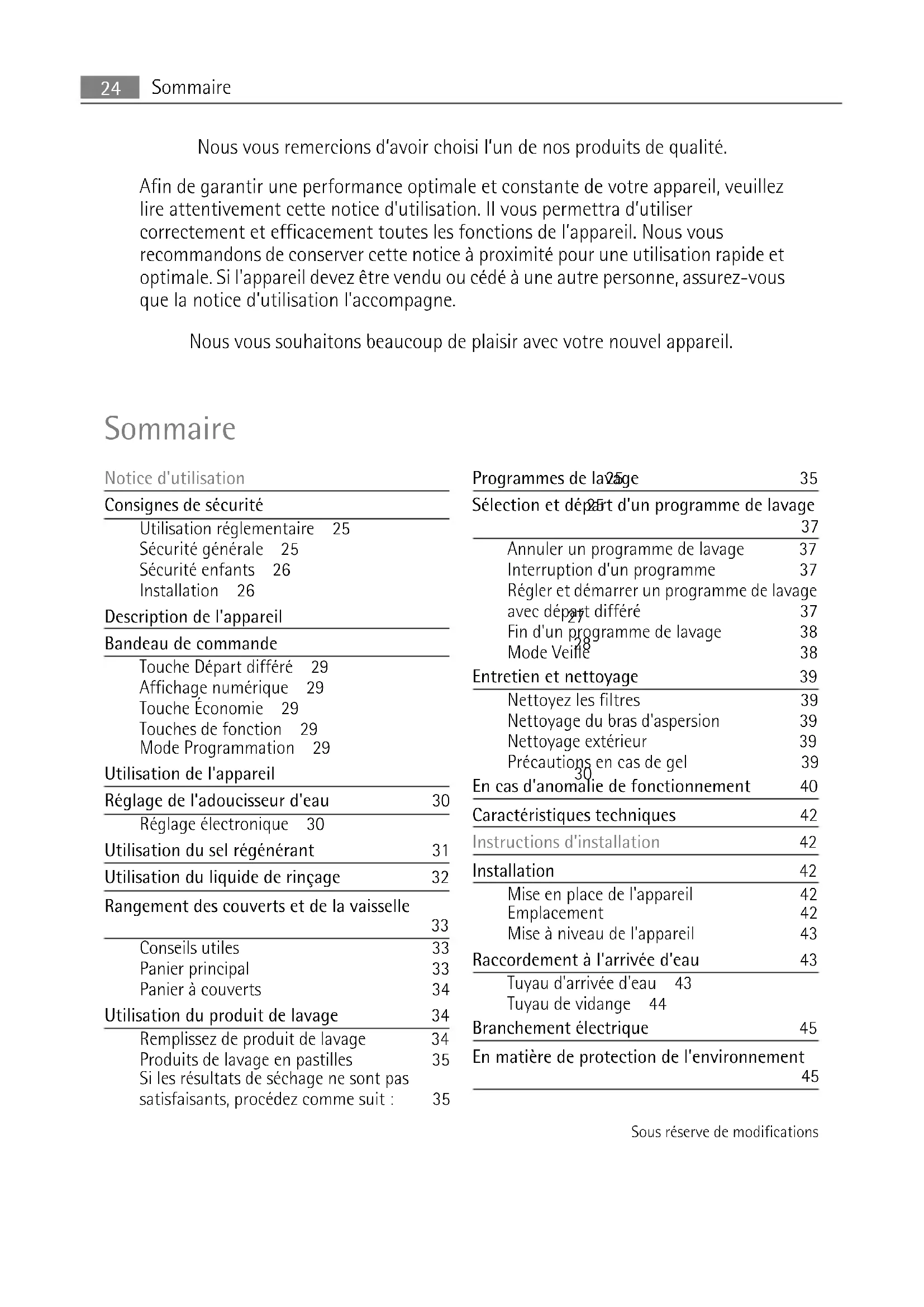 - Verwijder het slot van de deur. Dit voorkomt dat kinderen zichzelf in het apparaat in- sluiten en zo hun leven in gevaar brengen. Milieubescherming 23Nous vous remercions d’avoir choisi l’un de nos produits de qualité. Afin de garantir une performance optimale et constante de votre appareil, veuillez lire attentivement cette notice d'utilisation. Il vous permettra d’utiliser correctement et efficacement toutes les fonctions de l’appareil. Nous vous recommandons de conserver cette notice à proximité pour une utilisation rapide et optimale. Si l'appareil devez être vendu ou cédé à une autre personne, assurez-vous que la notice d'utilisation l'accompagne. Nous vous souhaitons beaucoup de plaisir avec votre nouvel appareil. Sommaire Notice d'utilisation 25 Consignes de sécurité 25 Utilisation réglementaire 25 Sécurité générale 25 Sécurité enfants 26 Installation 26 Description de l'appareil 27 Bandeau de commande 28 Touche Départ différé 29 Affichage numérique 29 Touche Économie 29 Touches de fonction 29 Mode Programmation 29 Utilisation de l'appareil 30 Réglage de l'adoucisseur d'eau 30 Réglage électronique 30 Utilisation du sel régénérant 31 Utilisation du liquide de rinçage 32 Rangement des couverts et de la vaisselle