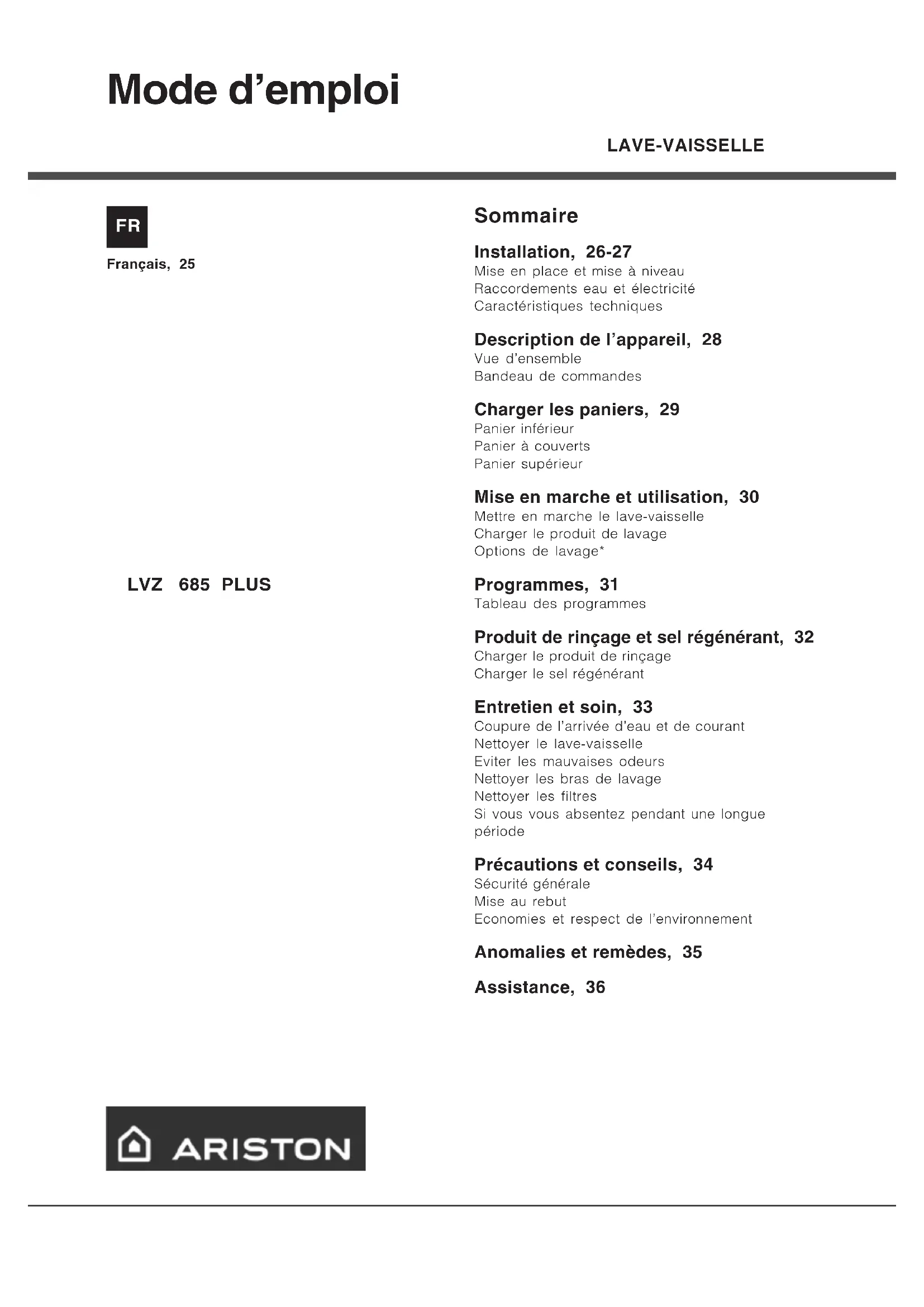 LVZ 685 Plus - Lave-vaisselle Ariston Thermo - Notice d'utilisation et mode d'emploi gratuit