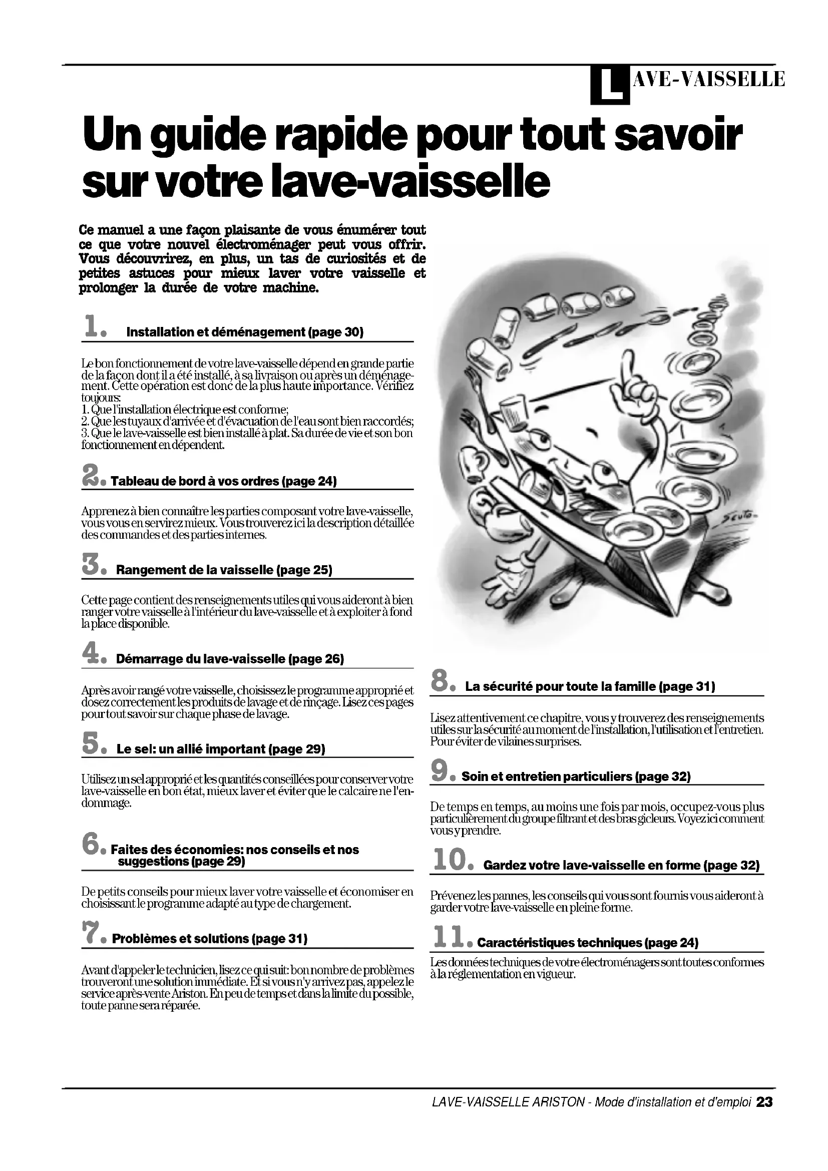 AVE-VAISSELLE La sécurité chez vous Votre lave-vaisselle a été fabriqué selon les réglementations internationales de sécurité les plus sévères en la matière. Elles vous protègent ainsi que votre famille. Lisez attentivement les avertissements et les renseignements de cette notice: ils vous fourniront des nouvelles utiles quant à la sécurité d'installation, d'utilisation et d'entretien de votre appareil. Pour ne pas avoir de mauvaises surprises. 1. Eliminez avec soin l'embal-lage (suivez les instructionsconcernant le dépôt sélectifdes déchets de votre Com-mune)2. Après avoir déballé l'appareil,contrôlez s'il est en bon état.Si vous avez le moindre doute,adressez-vous à un profession-nel du secteur.3. Votre lave-vaisselle ne doitêtre utilisé que par des adul-tes. N'y lavez que la vaissellede tous les jours en suivant lesinstructions de ce manuel. Netouchez pas la machine quandvous êtes pieds nus ou si vousavez les mains et les piedsmouillés.4. L'usage de rallonges et de pri-ses multiples est déconseillé.Si le câble d'alimentation élec-trique n'est pas assez long, fai-tes-le remplacer sans oublierqu'il ne doit pas être écraséou dangereusement plié.5. En cas de mauvais fonction-nement ou de travaux d'entre-tien, déconnectez l'appareil dela ligne (débranchez la fiche!).6. Gardez les enfants à bonnedistance des produits de la-vage et du lave-vaisselleouvert.7. N'installez pas votre lave-vais-selle à l'extérieur, même s'ilest abrité par un auvent: il estextrêmement dangereux de lelaisser sous la pluie et les ora- ges. 8. Ne touchez pas à la résistancependant et dès la fin du cyclede lavage.9. Ne vous appuyez pas et nevous asseyez pas sur la porteouverte, vous risqueriez defaire basculer le lave-vaisselle.10. En cas de panne, fermez lerobinet d'arrivée de l'eau etdébranchez la fiche de la prisemurale. Consultez le chapitre"Si vous avez des problèmes,lisez ce qui suit". S'il n'y a pasde solution possible, appelezle service après-vente. Au moindre problème, lisez ce qui suit Il peut arriver que le lave-vaisselle fonctionne mal ou pas du tout. La plupart du temps, vous pouvez résoudre ces problèmes vous-même. Avant de téléphoner au service après-vente, lisez ces quelques lignes. Le lave-vaisselle nedémarre pas■ Le robinet de l'eau est-il bienouvert?■ Le robinet de l'eau est-il bien rac-cordé au tuyau?■ Y a-t-il une coupure d'eau à lamaison?■ La pression de l'eau est-elle suf-fisante?■ Le tuyau est-il plié?■ Le filtre du tuyau d'arrivée del'eau est-il bouché?■ La porte du lave-vaisselle est-elle ouverte?La vaisselle n'est paspropre.■ Avez-vous utilisé une dose deproduit de lavage idoine?■ Le programme de lavage sélec-tionné est-il approprié à la vais-selle que vous avez chargée?■ Le filtre et le micro-filtre sont-ils propres?■ Les gicleurs sont-ils libres?Le lave-vaisselle nevidange pas■ Le tuyau d'évacuation est-ilplié?Le lave-vaisselleprésente des dépôts decalcaire ou une coucheblanche.■ Le bouchon du réservoir à selest-il bien fermé?■ La quantité de produit de rin-çage est-elle bien dosée?Messages d'erreur.Votre lave-vaisselle monte undispositif de sécurité à même dedétecter des anomalies defonctionnement. Ces anomaliessont signalées par un ou deuxvoyants "G" qui clignotent trèsrapidement. Après avoir pris notedes voyants qui clignotent,éteignez votre appareil et appelezl'assistance technique.Alarme robinet ferméSi vous avez oublié d'ouvrir le robi-net de l'eau, votre machine vous lesignale pendant quelques minutesen émettant de brefs signauxacoustiques. Ouvrez le robinet et,au bout de quelques minutes, votremachine redémarrera. Si vousn'êtes pas là quand les signauxacoustiques retentissent,votreappareil s'arrête et les voyants desprogrammes 2 et 3 (lavage etrinçages) clignotent trèsrapidement.Eteignez l'appareil, ouvrez le robi-net de l'eau et au bout de 20 se-condes rallumez l'appareil:recommencez les opérations deprogrammation, le programmeredémarrera.Alarme filtres bouchésSi la machine est bloquée et lesvoyants phases programme 1 et 3(prélavage et rinçages) clignotentrapidement, c'est que le filtre estbouché par de gros résidus d'ali-ments. Eteignez l'appareil, net-toyez soigneusement le filtre etaprès l'avoir remonté à son empla-cement comme indiqué page 32,rallumez. Recommencez lesopérations de programmation, leprogramme redémarrera.Alarme pour panne del'électrovanne d'entréede l'eau.Si le voyant 2 (lavage) clignote Problèmes et solutions rapidement, il faut ETEINDREvotre lave-vaisselle et leREMETTRE EN MARCHE aubout d'une minute. Si l'alarme per-siste, fermez avant tout le robinetde l'eau pour éviter tout risqued'inondation puis coupez le courantet appelez le service de dépannage.Vous avez tout vérifiémais votre lave-vaisselle ne fonctionnetoujours pas et leproblème persiste?Appelez le service après-vente leplus proche de chez vous etn'oubliez pas de leur signaler: ile type de panne le sigle du modèle (Mod....) et lenuméro de série (S/N ....) que voustrouverez sur l'étiquette signaléti-que appliquée sur le côté de la con-tre-porte11. Rendez inutilisables vos appa-reils hors d'usage comme suit:coupez le câble d'alimentationet rendez le verrouillage de laporte inopérant.J'exige un technicienspécialisé et agréé qui montedes pièces détachéesoriginales garanties parAriston!Ne faites jamais appel àdes techniciens nonagréés et exigeztoujours l'installationde pièces détachéesoriginales.L AVE-VAISSELLE