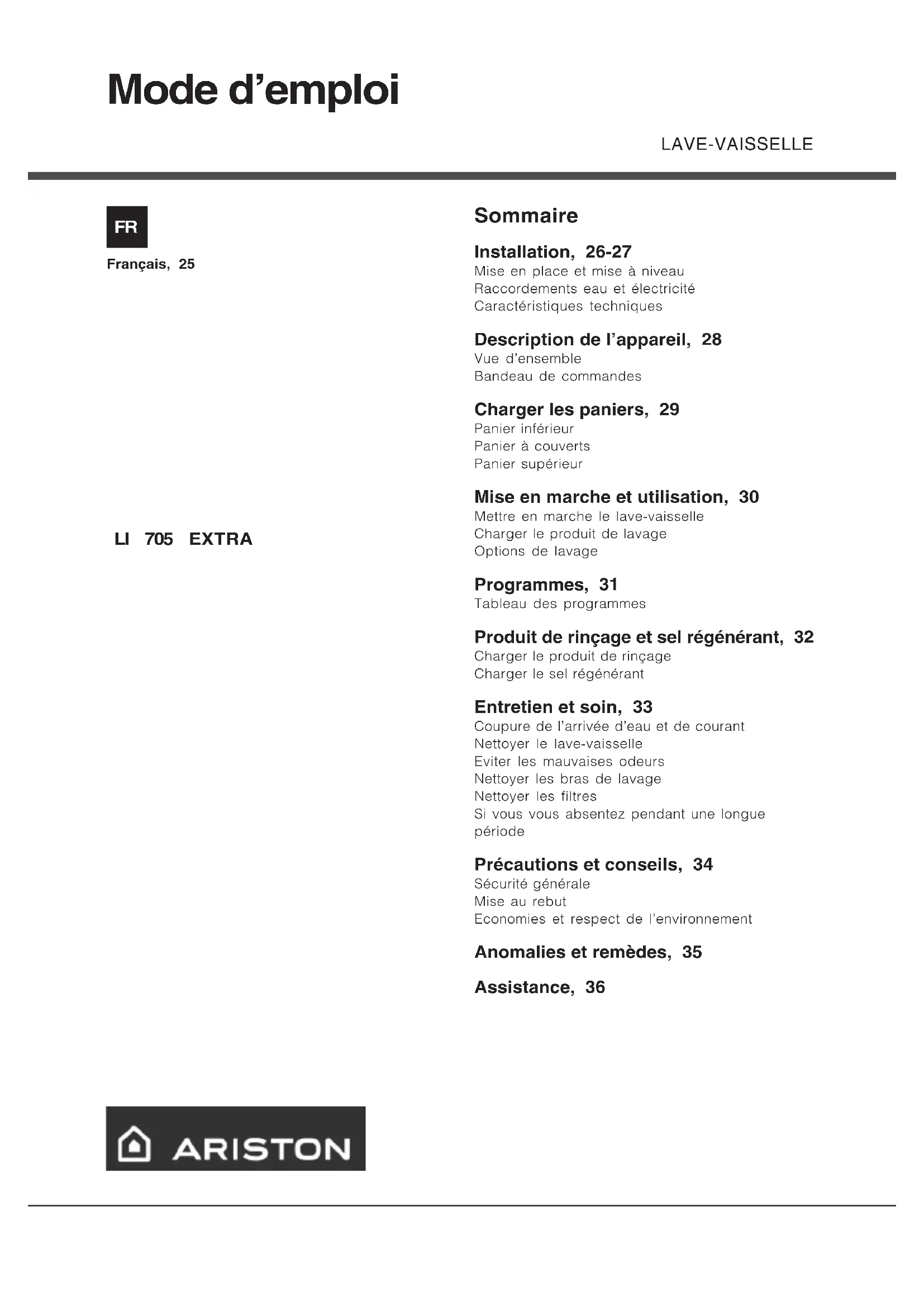 LI 705 Extra - Lave-vaisselle Ariston Thermo - Notice d'utilisation et mode d'emploi gratuit