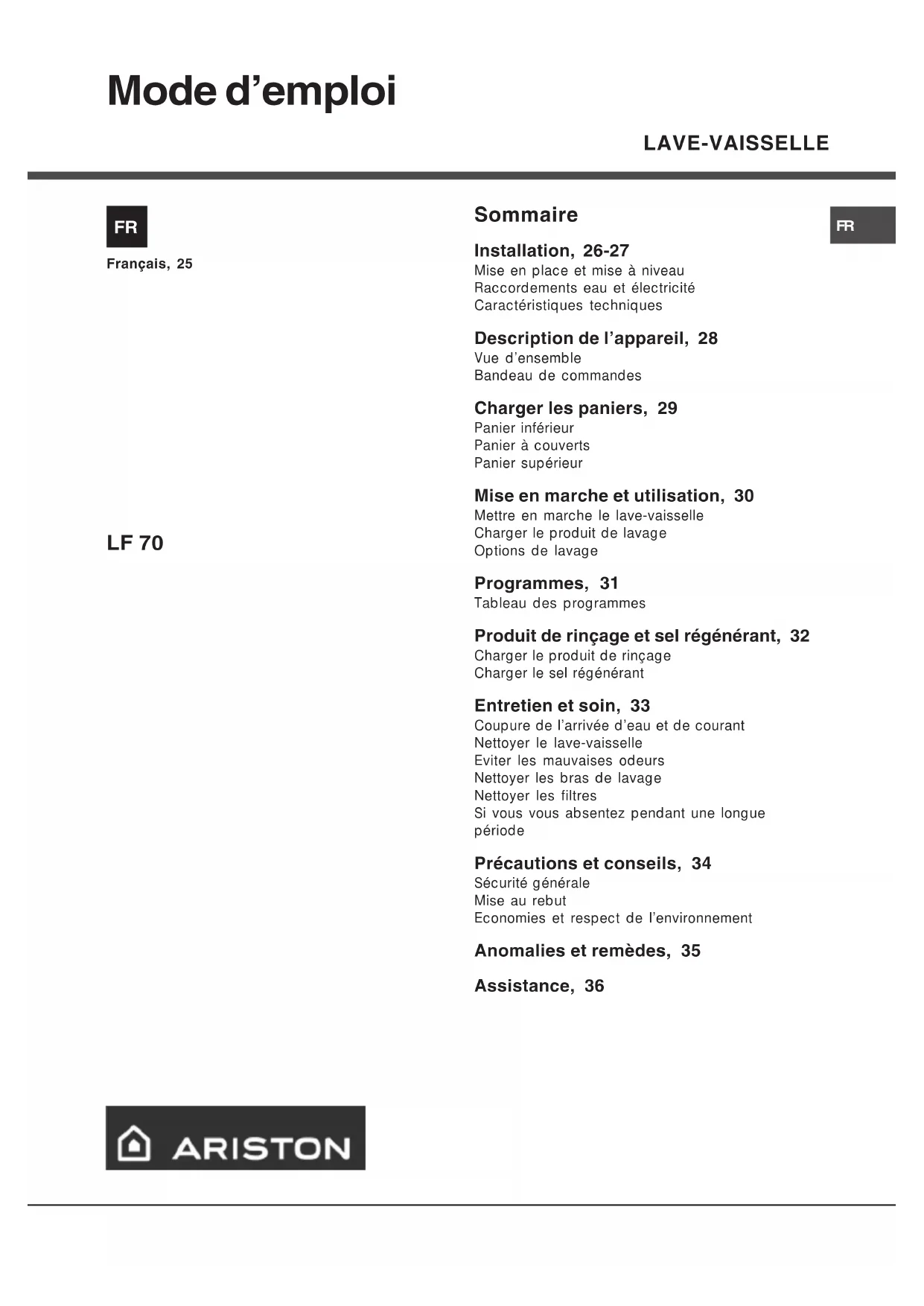 LF70FR - Lave-vaisselle Ariston Thermo - Notice d'utilisation et mode d'emploi gratuit