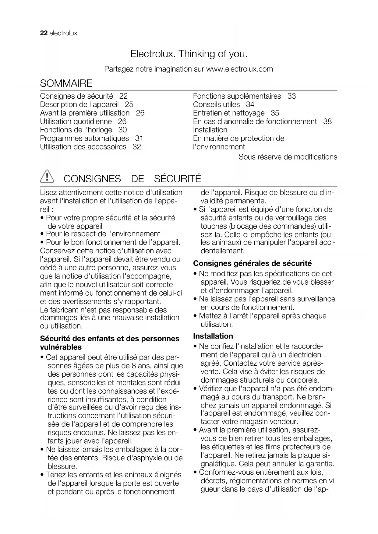 Installation électrique Avertissement Le branchement électrique doit être confié à un électricien qualifié. Le fabricant ne peut pas être tenu res- ponsable si vous ne respectez pas les consignes de sécurité du chapitre « Consignes de sécurité ». Cet appareil est fourni avec une fiche princi- pale et un câble principal. Câble d'alimentation Types de câbles applicables pour l'installa- tion ou le remplacement: H07 RN-F, H05 RN-F, H05 RRF, H05 VV-F, H05 V2V2-F (T90), H05 BB-F. Pour la section du câble, consultez la puis- sance totale (sur la plaque signalétique) et le tableau : Puissance totale Section du câble maximum 1 380 W 3 x 0,75 mm² maximum 2 300 W 3 x 1 mm² maximum 3 680 W 3 x 1,5 mm² Le fil de masse (fil jaune/vert) doit faire 2 cm de plus que les fils de phase et le neutre (fils bleu et marron). EN MATIÈRE DE PROTECTION DE L'ENVIRONNEMENT Le symbole sur le produit ou son emballage indique que ce produit ne peut être traité comme déchet ménager. Il doit être remis au point de collecte dédié à cet 40 electroluxeffet (collecte et recyclage du matériel électrique et électronique). En procédant à la mise au rebut de l'appareil dans les règles de l’art, nous préservons l'environnement et notre sécurité, s’assurant ainsi que les déchets seront traités dans des conditions optimum. Pour obtenir plus de détails sur le recyclage de ce produit, veuillez prendre contact avec les services de votre commune ou le magasin où vous avez effectué l'achat. Emballage Les matériaux d'emballage sont con- çus dans le respect de l'environnement et sont recyclables. Les pièces en plas- tique sont marquées des abréviations internationales telles que PE, PS, etc. Eliminez les emballages dans les con- teneurs de la commune prévus à cet effet. electrolux 41Electrolux. Thinking of you. Mehr zu unserem Denken finden Sie unter www.electrolux.com INHALT Sicherheitshinweise 42 Gerätebeschreibung 45 Vor der ersten Inbetriebnahme 46 Täglicher Gebrauch 46 Uhrfunktionen 50 Automatikprogramme 51 Verwendung des Zubehörs 52 Zusatzfunktionen 53 Praktische Tipps und Hinweise 54 Reinigung und Pflege 55 Was tun, wenn … 58 Montage 59 Umwelttipps 60 Änderungen vorbehalten SICHERHEITSHINWEISE Lesen Sie vor der Installation und Anwen- dung sorgfältig dieses Handbuch: