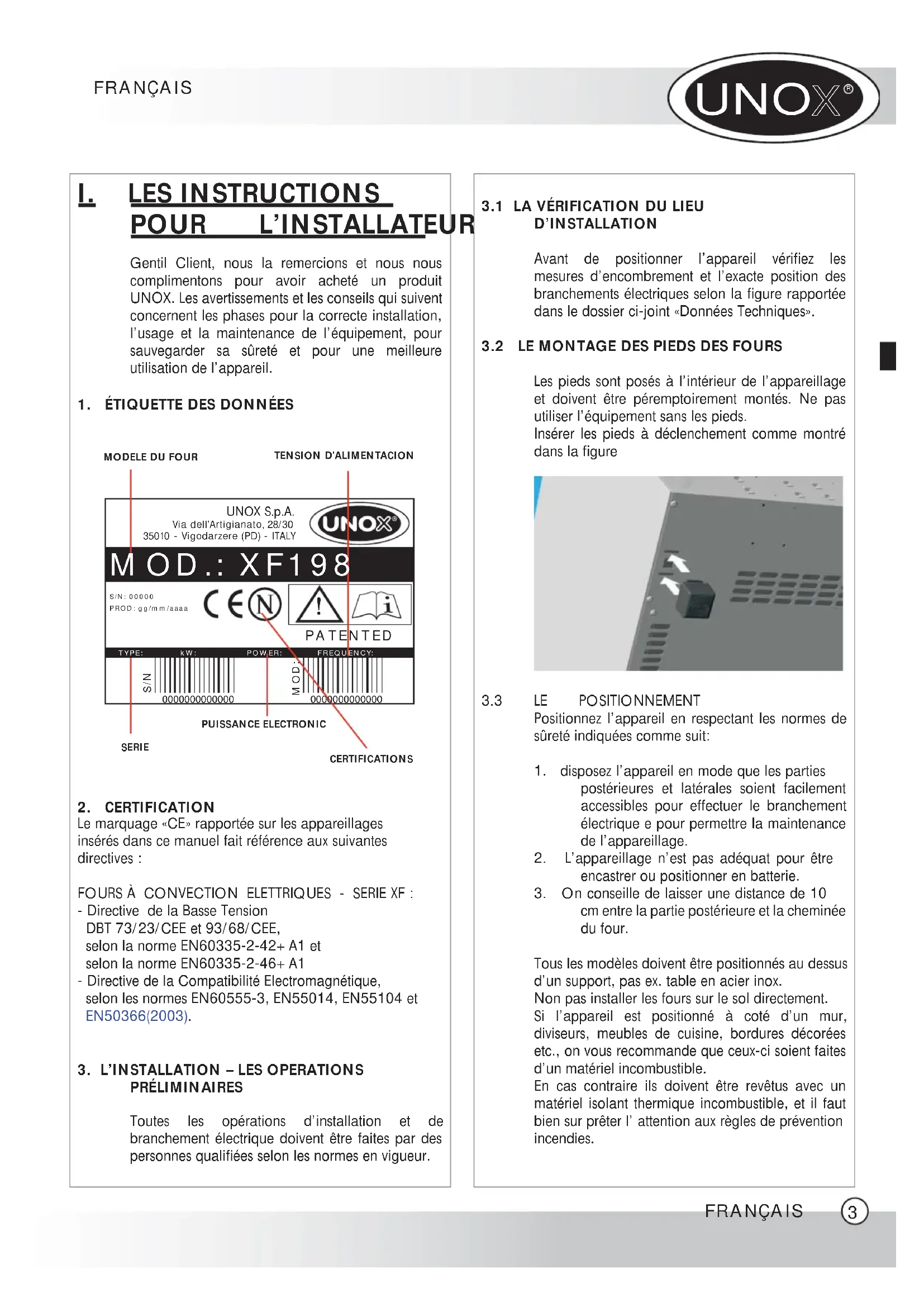 Gentil Client, nous la remercions et nous nous complimentons pour avoir acheté un produit UNOX. Les avertissements et les conseils qui suivent concernent les phases pour la correcte installation, l’usage et la maintenance de l’équipement, pour sauvegarder sa sûreté et pour une meilleure utilisation de l’appareil.1. ÉTIQUETTE DES DONNÉES2. CERTIFICATIONLe marquage «CE» rapportée sur les appareillagesinsérés dans ce manuel fait référence aux suivantesdirectives :FOURS À CONVECTION ELETTRIQUES - SERIE XF : - Directive de la Basse Tension DBT 73/23/CEE et 93/68/CEE, selon la norme EN60335-2-42+A1 et selon la norme EN60335-2-46+A1- Directive de la Compatibilité Electromagnétique, selon les normes EN60555-3, EN55014, EN55104 et EN50366(2003). 3. L’INSTALLATION – LES OPERATIONS PRÉLIMINAIRESToutes les opérations d’installation et de branchement électrique doivent être faites par des personnes qualifiées selon les normes en vigueur.3.1 LA VÉRIFICATION DU LIEU D’INSTALLATIONAvant de positionner l’appareil vérifiez les mesures d’encombrement et l’exacte position des branchements électriques selon la figure rapportée dans le dossier ci-joint «Données Techniques».3.2 LE MONTAGE DES PIEDS DES FOURS Les pieds sont posés à l’intérieur de l’appareillage et doivent être péremptoirement montés. Ne pas utiliser l’équipement sans les pieds.Insérer les pieds à déclenchement comme montré dans la figure 3.3 LE POSITIONNEMENTPositionnez l’appareil en respectant les normes de sûreté indiquées comme suit:1. disposez l’appareil en mode que les parties postérieures et latérales soient facilement accessibles pour effectuer le branchement électrique e pour permettre la maintenance de l’appareillage.2. L’appareillage n’est pas adéquat pour être encastrer ou positionner en batterie.3. On conseille de laisser une distance de 10 cm entre la partie postérieure et la cheminée du four.Tous les modèles doivent être positionnés au dessus d’un support, pas ex. table en acier inox.Non pas installer les fours sur le sol directement.Si l’appareil est positionné à coté d’un mur, diviseurs, meubles de cuisine, bordures décorées etc., on vous recommande que ceux-ci soient faites d’un matériel incombustible.En cas contraire ils doivent être revêtus avec un matériel isolant thermique incombustible, et il faut bien sur prêter l’ attention aux règles de préventionincendies. FRANÇAIS FRANÇAIS