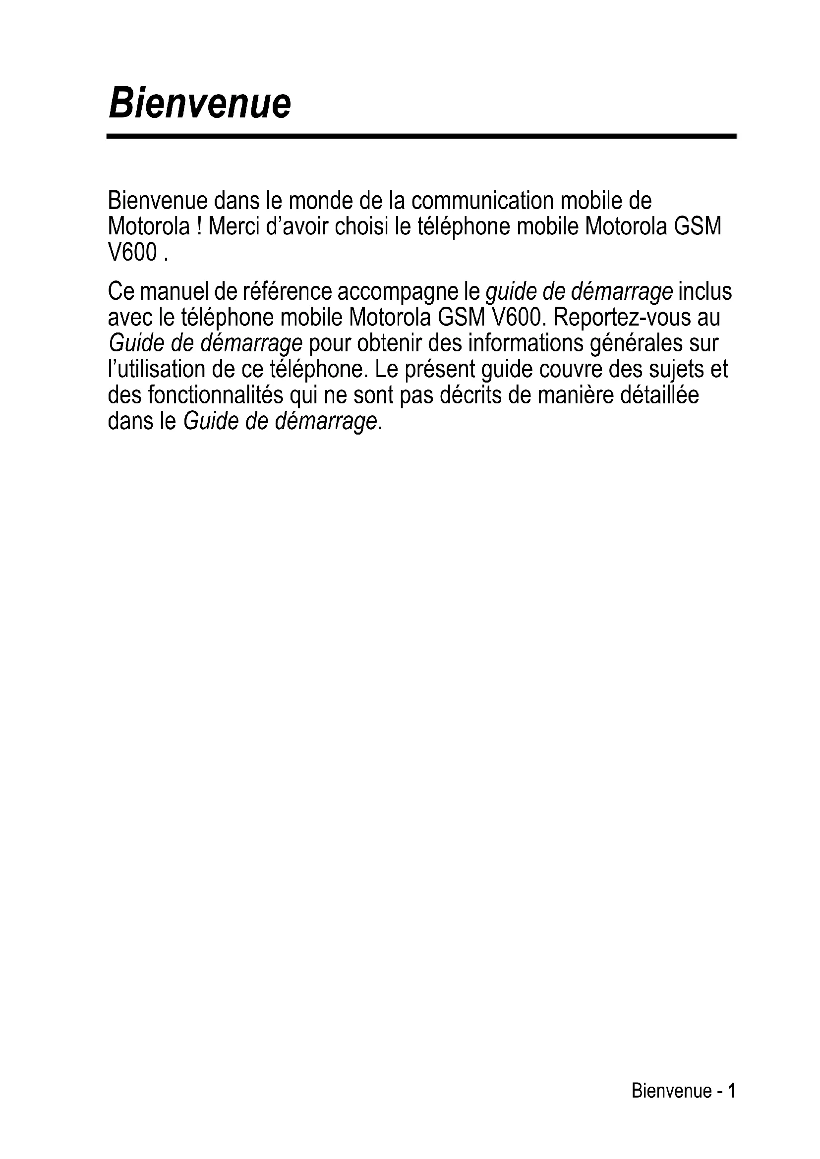 Bienvenue - 1 Bienvenue Bienvenue dans le monde de la communication mobile de Motorola ! Merci d’avoir choisi le téléphone mobile Motorola GSM V600 . Ce manuel de référence accompagne le guide de démarrage inclus avec le téléphone mobile Motorola GSM V600. Reportez-vous au Guide de démarrage pour obtenir des informations générales sur l’utilisation de ce téléphone. Le présent guide couvre des sujets et des fonctionnalités qui ne sont pas décrits de manière détaillée dans le Guide de démarrage.2 - Bienvenue www.motorola.com MOTOROLA et le logo M stylisé sont des marques déposées au Bureau américain des marques et brevets. Les marques déposées de Bluetooth appartiennent à leur propriétaire et sont utilisées sous licence par Motorola, Inc. Java et toutes les autres marques basées sur Java sont des marques ou des marques déposées de Sun Microsystems, Inc., aux Etats-Unis et dans d’autres pays. Les autres noms de produits et de services appartiennent à leurs propriétaires respectifs