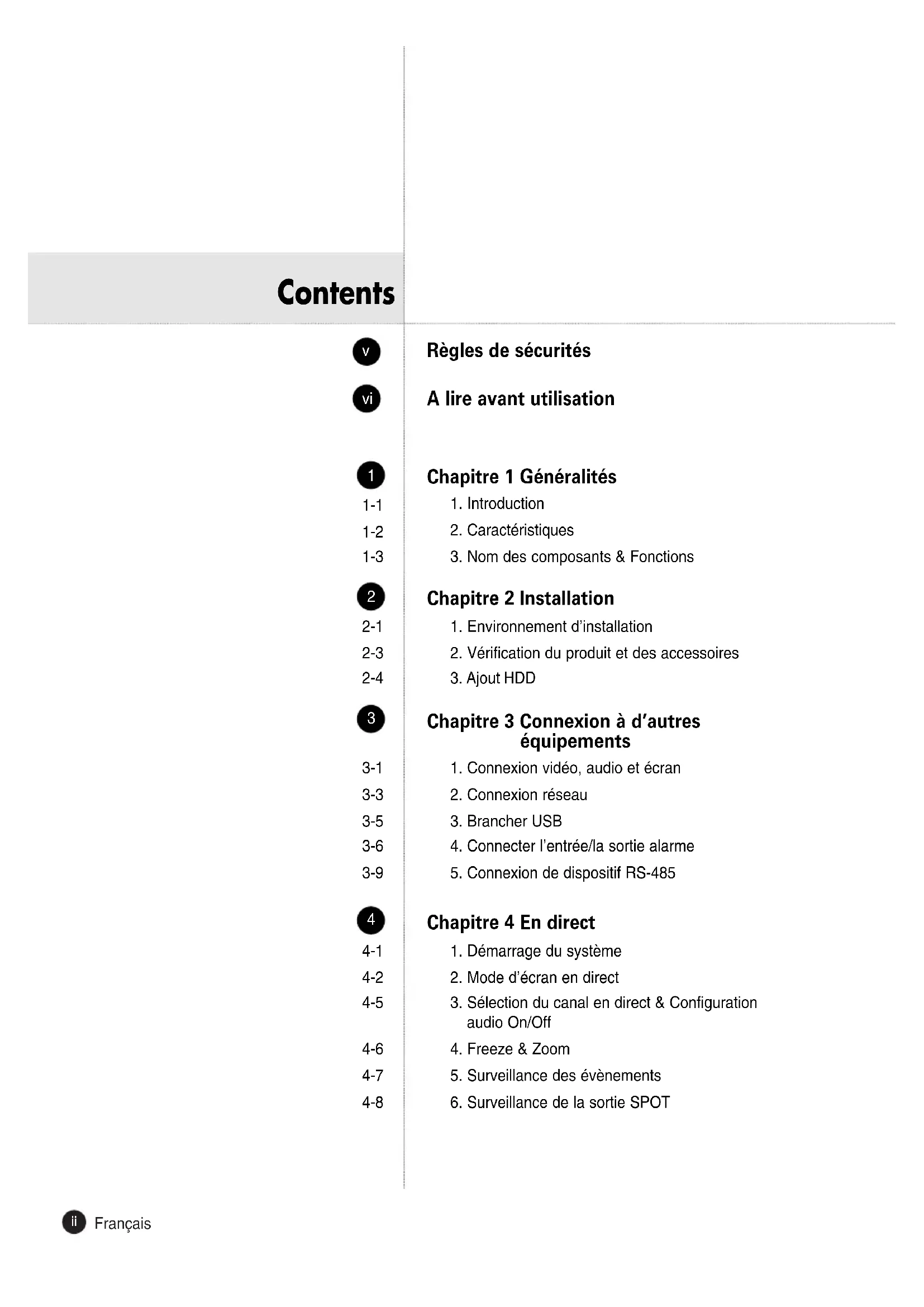 SHR-2160/2162/2080/2082-FRA-1 4/25/07 10:29 AM Page 1-12 Caractéristiques 1-2 ■ Connecteurs d’entrée composite à 16 / 8 canaux■ Source vidéo compatible NTSC / PAL ( NTSC : SHR-2162, SHR-2160, SHR-2082, SHR-2080, SHR-2162N, SHR-2160N, SHR-2082N, SHR-2080N PAL: SHR-2162P, SHR-2160P, SHR-2082P, SHR-2080P ) ■ Possibilité d’enregistrer l’image vidéo de taille CIF (NTSC-352 x 240/PAL-352 x 288) à la vitesse de 120 ips(NTSC) / 100ips(PAL) (image par seconde) ■ Boucle de 16 / 8 canaux par connecteurs vidéo■ Mode refrappe du disque dur Hard Disk Overwrite Mode ■ Sauvegarde de disque dur de grande capacité à l’aide du câble USB2.0■ Fonction de sauvegarde à la mémoire USB2.0 et graveur externe du CD/DVD (SHR-2162 / 2082 supporte l’interne CD-RW.) ■ Possibilité d’enregistrer, lire et transmettre simultanément les fichiers audio / video vers Windows Network Viewer (Smart Viewer) ■ Enregistrement du canal vidéo 16 / 8, fonction Enregistrement / Lecture■ Divers modes de recherche (Heure/Date, Evènement, Caméra)■ Divers modes d’enregistrement (Durée, Evènement, Programmation)■ Connexion de disques durs externes (USB2.0)■ Interface d’alarme (16 / 8 entrées, 4 sorties, 1 reset)■ Surveillance à distance par Windows Network Viewer (Smart Viewer) Français SHR-2160/2162/2080/2082-FRA-1 4/25/07 10:29 AM Page 1-2Français