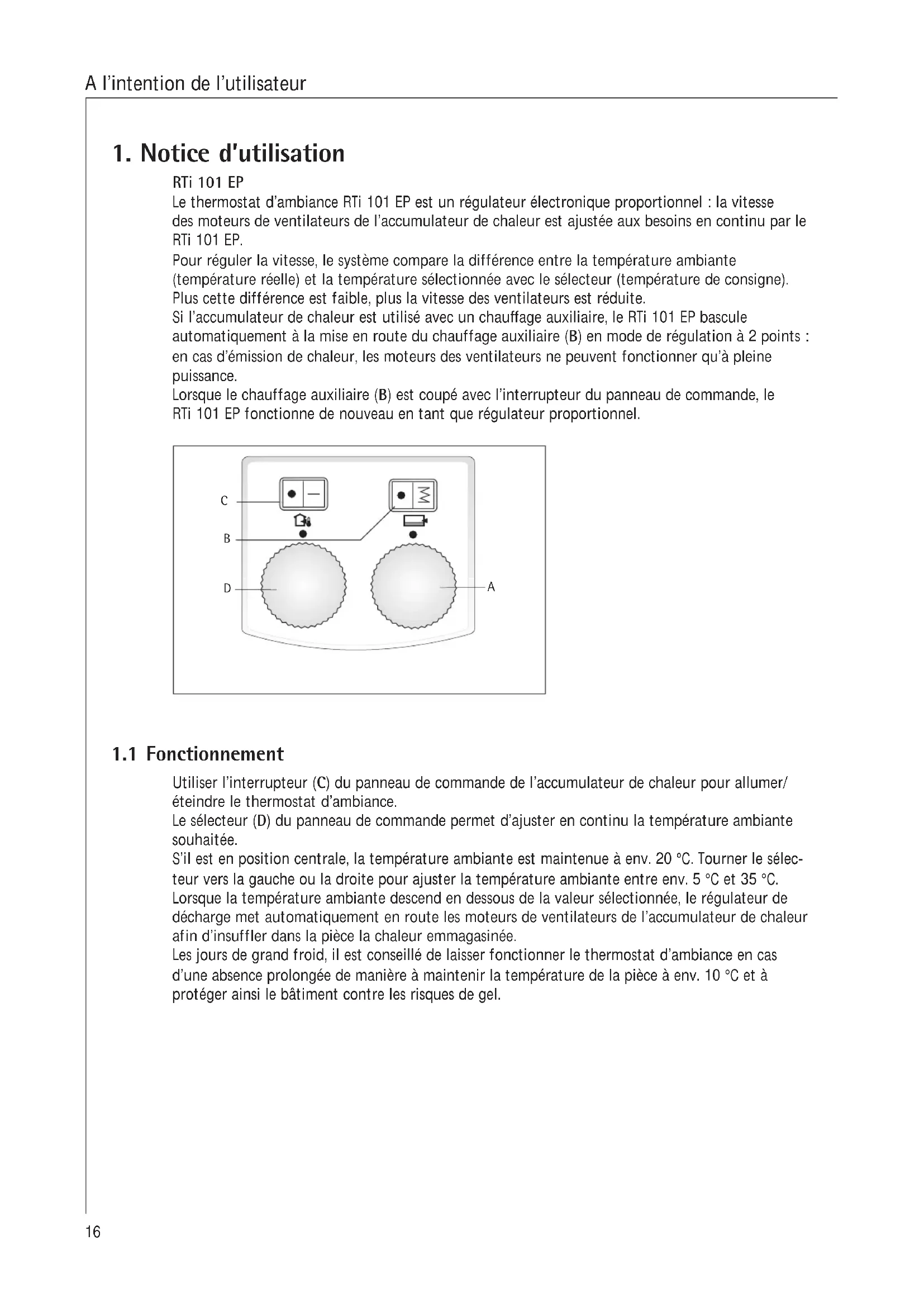 RTi 101 EP Le thermostat d’ambiance RTi 101 EP est un régulateur électronique proportionnel : la vitesse des moteurs de ventilateurs de l’accumulateur de chaleur est ajustée aux besoins en continu par le RTi 101 EP. Pour réguler la vitesse, le système compare la différence entre la température ambiante (température réelle) et la température sélectionnée avec le sélecteur (température de consigne). Plus cette différence est faible, plus la vitesse des ventilateurs est réduite. Si l’accumulateur de chaleur est utilisé avec un chauffage auxiliaire, le RTi 101 EP bascule automatiquement à la mise en route du chauffage auxiliaire (B) en mode de régulation à 2 points : en cas d’émission de chaleur, les moteurs des ventilateurs ne peuvent fonctionner qu’à pleine puissance. Lorsque le chauffage auxiliaire (B) est coupé avec l’interrupteur du panneau de commande, le RTi 101 EP fonctionne de nouveau en tant que régulateur proportionnel.