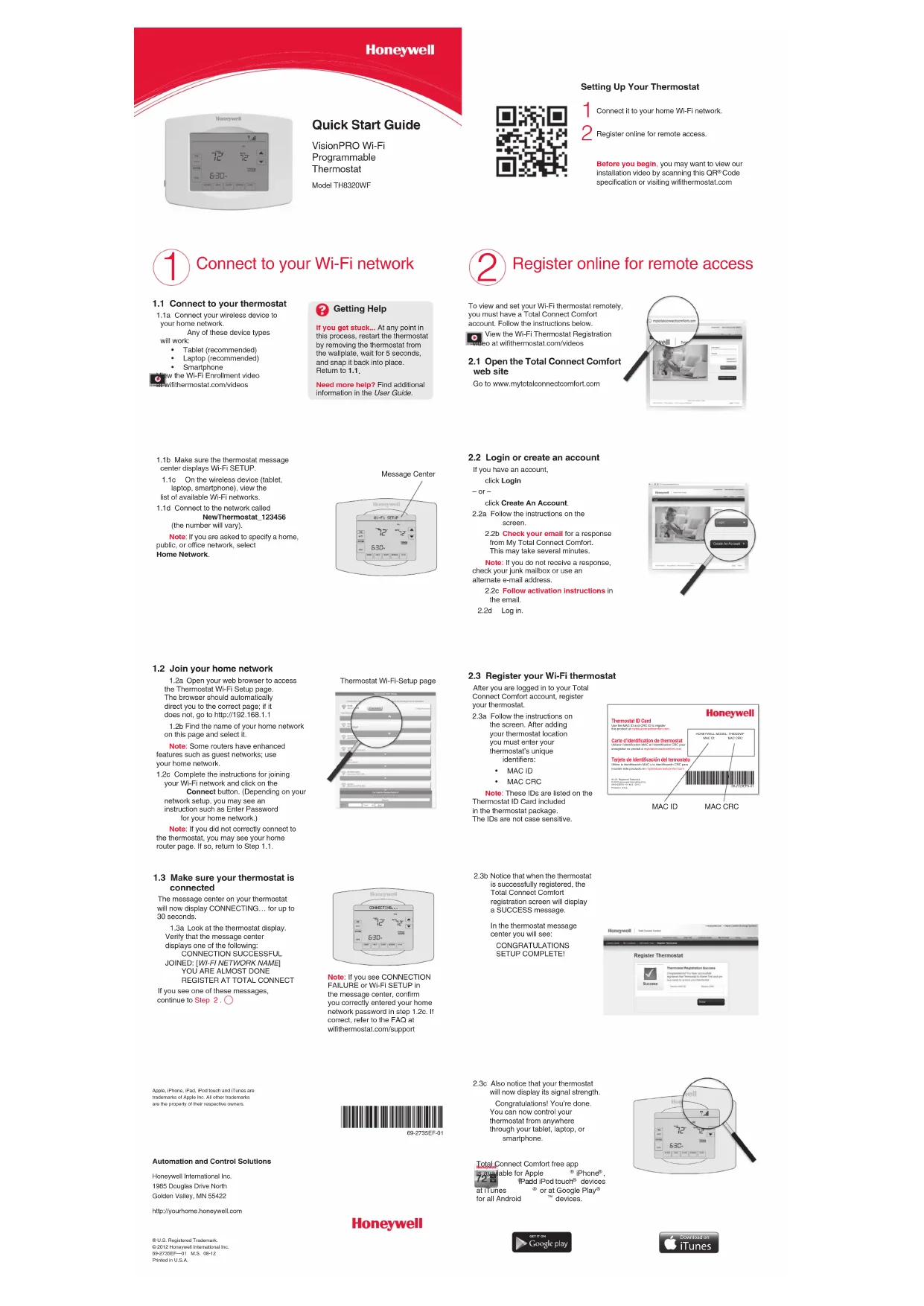 for all Android ™ devices.GET IT ONDownload on iTunes® U.S. Registered Trademark.© 2012 Honeywell International Inc.69-2723EFS—01 M.S. 04-12Printed in U.S.A.HONEYWELL MODEL: TH8320WFMAC ID: MAC CRC: 69-2723EFS-01Thermostat ID CardUse the MAC ID and CRC ID to register this product at mytotalconnectcomfort.comCarte d’identification de thermostatUtilisez l’identication MAC et l’identication CRC pour enregistrer ce produit à mytotalconnectcomfort.comTarjeta de identificación del termostatoUtilice la identicación MAC y la identicación CRC para inscribir este producto en mytotalconnectcomfort.comConnectez-le au réseau sans fil de votre domicile.Enregistrez-vous en ligne pour bénéficier de l’accès à distance.Avant de commencer, vous désirerez peut-être visionner une courte vidéo d’installation. Utilisez le QR Code® figurant sur la couverture de ce guide ou consultez le site wifithermostat.com Réglage de votre thermostat