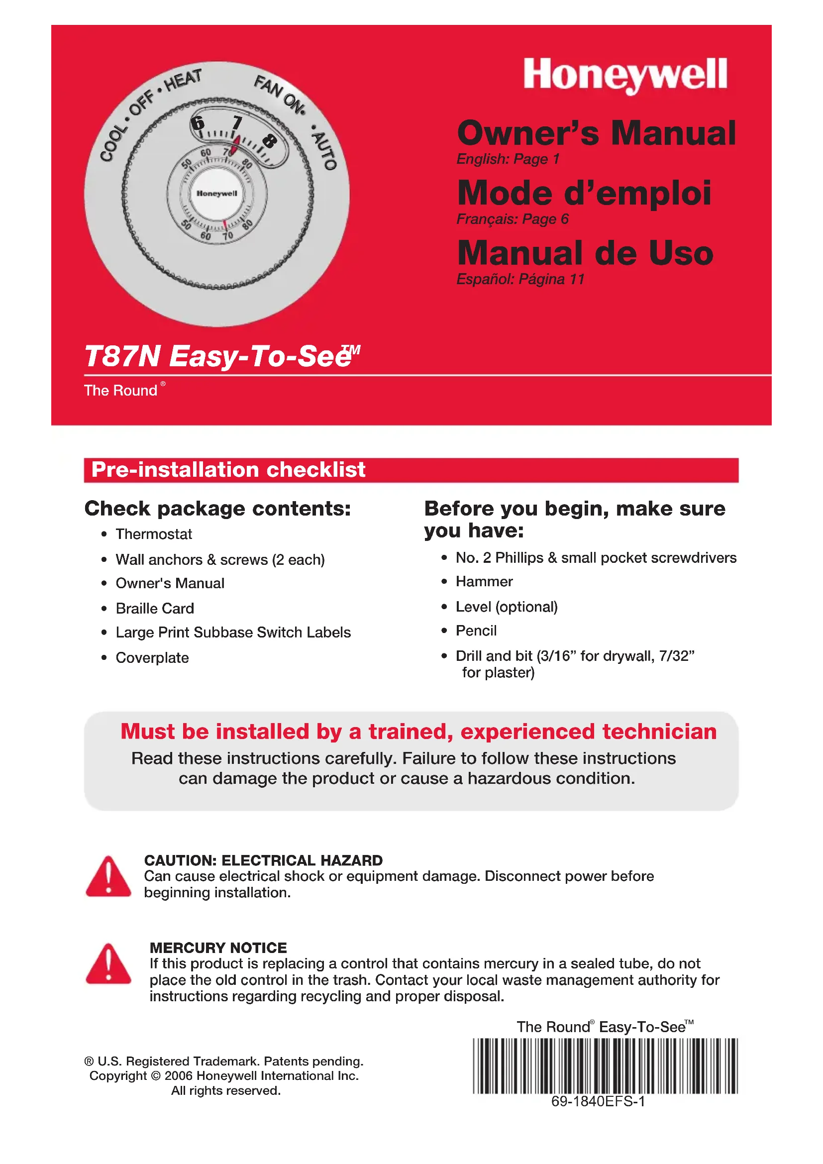 reçu la formation pertinente. Lire attentivement les instructions. Le fait de ne pas les suivre risque d’endommager le produit ou de constituer un danger.AVIS SUR LE MERCURESi le nouveau thermostat remplace un ancien régulateur contenant un contact à mercure, ne pas mettre l’ancien régulateur aux poubelles. Communiquer avec le service local de cueillette des déchets pour obtenir de l’information sur le recyclage ou sur la bonne façon de disposer d’un ancien régulateur contenant un contact à mercure.MISE EN GARDE : RISQUE DE CHOC ÉLECTRIQUEPeut provoquer des chocs électriques ou endommager le matériel. Couper l’alimentation électrique avant d’effectuer le raccordement. T87N Easy-To-See