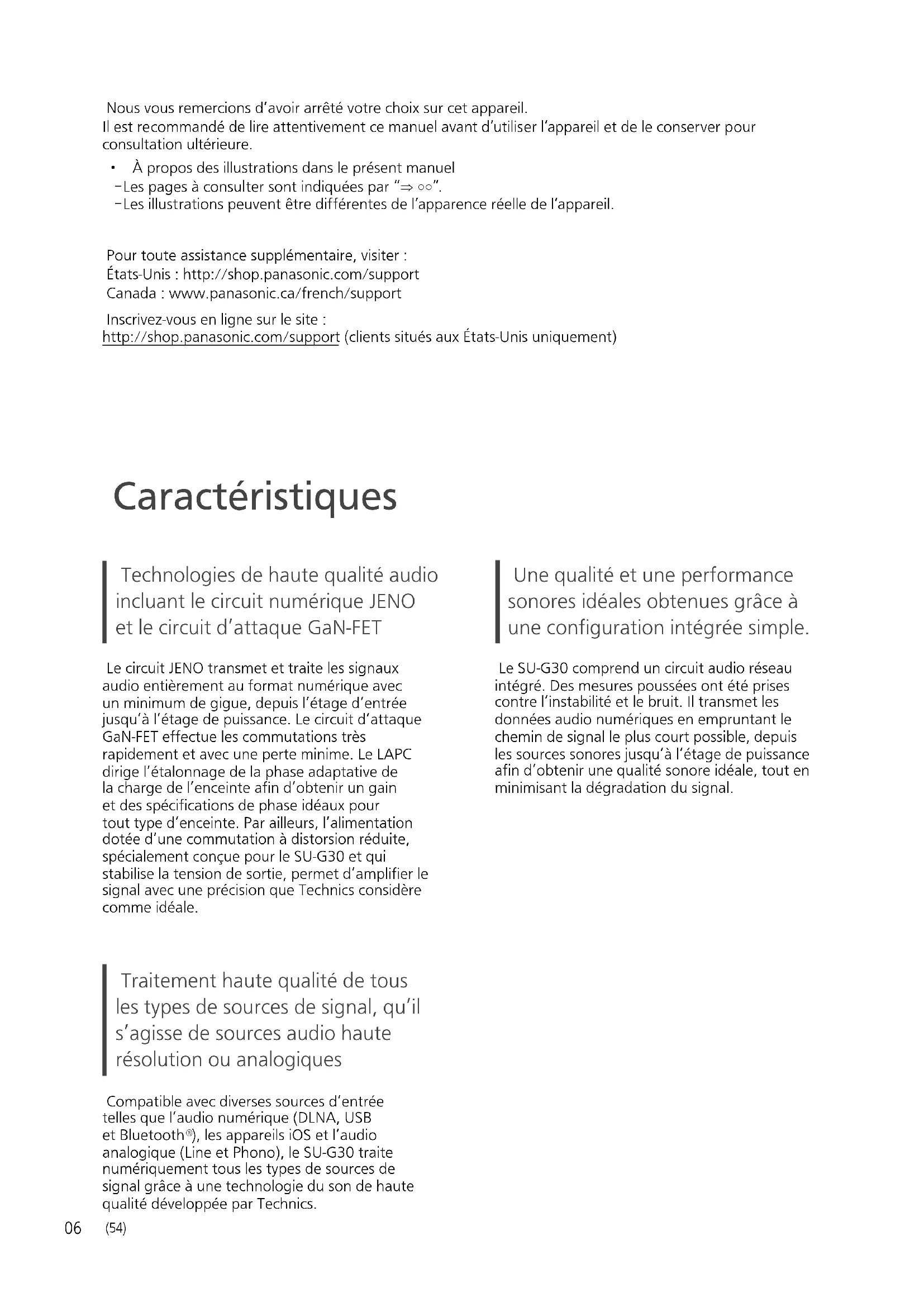 - À propos des illustrations dans le présent manuel - Les pages à consulter sont indiquées par “ ○○”. - Les illustrations peuvent être différentes de l’apparence réelle de l’appareil. Pour toute assistance supplémentaire, visiter : États-Unis : http://shop.panasonic.com/support Canada : www.panasonic.ca/french/support Inscrivez-vous en ligne sur le site : http://shop.panasonic.com/support (clients situés aux États-Unis uniquement) Technologies de haute qualité audio incluant le circuit numérique JENO et le circuit d’attaque GaN-FET Le circuit JENO transmet et traite les signaux audio entièrement au format numérique avec un minimum de gigue, depuis l’étage d’entrée jusqu’à l’étage de puissance. Le circuit d’attaque GaN-FET effectue les commutations très rapidement et avec une perte minime. Le LAPC dirige l’étalonnage de la phase adaptative de la charge de l’enceinte afin d’obtenir un gain et des spécifications de phase idéaux pour tout type d’enceinte. Par ailleurs, l’alimentation dotée d’une commutation à distorsion réduite, spécialement conçue pour le SU-G30 et qui stabilise la tension de sortie, permet d’amplifier le signal avec une précision que Technics considère comme idéale. Traitement haute qualité de tous les types de sources de signal, qu’il s’agisse de sources audio haute résolution ou analogiques Compatible avec diverses sources d’entrée telles que l’audio numérique (DLNA, USB et Bluetooth