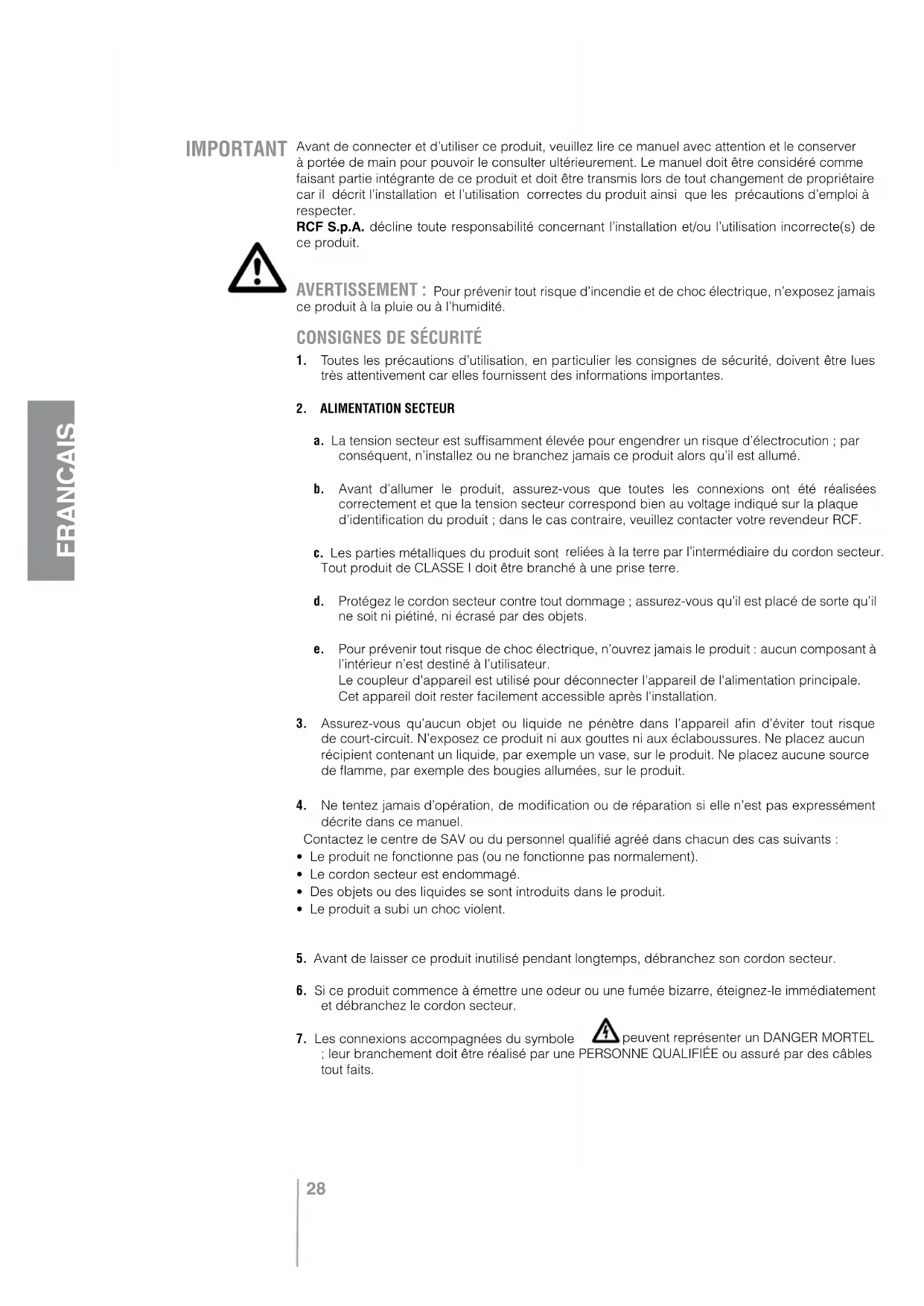 a. La tension secteur est suffisamment élevée pour engendrer un risque d'électrocution ; par conséquent, n'installez ou ne branchez jamais ce produit alors qu'il est allumé. b. Avant d'allumer le produit, assurez-vous que toutes les connexions ont été réalisées correctement et que la tension secteur correspond bien au voltage indiqué sur la plaque d'identification du produit ; dans le cas contraire, veuillez contacter votre revendeur RCF. c. Les parties métalliques du produit sont reliées à la terre par l'intermédiaire du cordon secteur. Tout produit de CLASSE I doit être branché à une prise terre. d. Protégez le cordon secteur contre tout dommage ; assurez-vous qu'il est placé de sorte qu'il ne soit ni piétiné, ni écrasé par des objets. e. Pour prévenir tout risque d'électrocution, n'ouvrez jamais le produit : aucun composant à l'intérieur n'est destiné à l'utilisateur. Le coupleur d'appareil est utilisé pour déconnecter l'appareil de l'alimentation principale. Cet appareil doit rester facilement accessible après l'installation. 3. Assurez-vous qu'aucun objet ou liquide ne pénètre dans l'appareil afin d'éviter tout risque de court-circuit. N'exposez ce produit ni aux gouttes ni aux éclaboussures. Ne placez aucune récipient contenant un liquide, par exemple un vase, sur le produit. Ne placez aucune source de flamme, par exemple des bougies allumées, sur le produit. 4. Ne tentez jamais d'opération, de modification ou de réparation si elle n'est pas expressément décrite dans ce manuel.