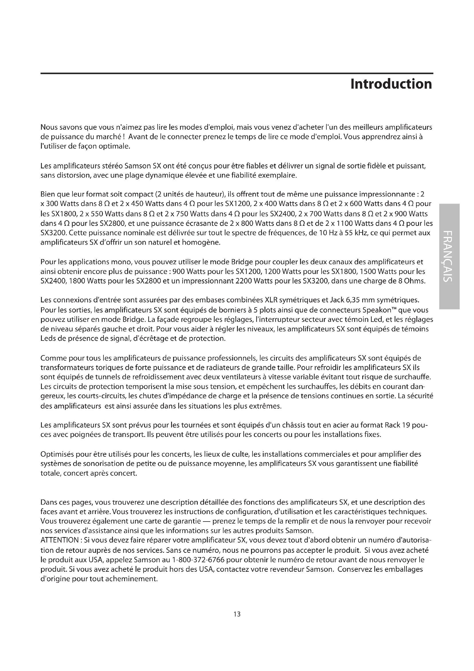 Dans ces pages, vous trouvez une description détaillée des fonctions des amplificateurs SX, et une description des faces avant et arrière. Vous trouvez les instructions de configuration, d'utilisation et les caractéristiques techniques. Vous trouvez également une carte de garantie — prenez le temps de la replir et de nous la renvoyer pour receivevoir nos services d'assistance ainsi que les informations sur les autres produits Samson.