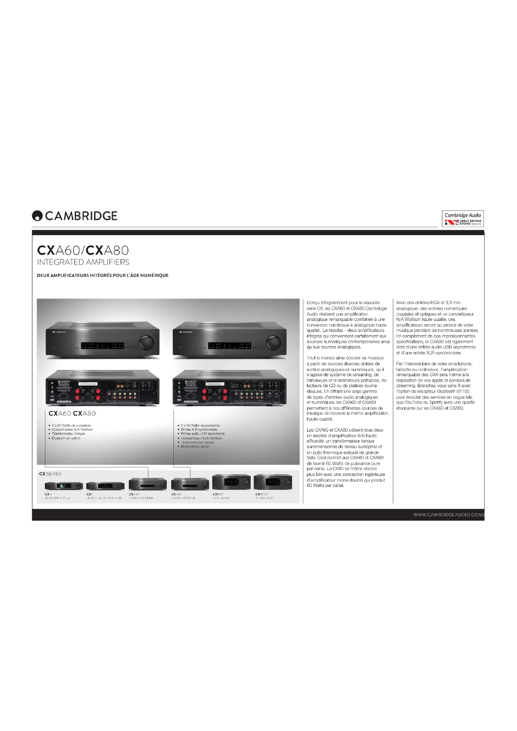 CX SERIES Conçu intégralement pour la nouvelle série CX, les CXA60 et CXA80 Cambridge Audio réalisent une amplication analogique remarquable combinée à une conversion numérique à analogique haute qualité. Le résultat – deux amplicateurs intégrés qui conviennent parfaitement aux sources numériques contemporaines ainsi qu’aux sources analogiques. Tout le monde aime écouter sa musique à partir de sources diverses dotées de sorties analogiques et numériques, qu’il s’agisse de système de streaming, de téléviseurs et d’ordinateurs portables, de lecteurs de CD ou de platines tourne- disques. En offrant une large gamme de types d’entrées audio analogiques et numériques, les CXA60 et CXA80 permettent à nos différentes sources de musique de recevoir la même amplication haute qualité. Les CXA60 et CXA80 utilisent tous deux un modèle d’amplicateur A/B haute efcacité, un transformateur torique surdimensionné de niveau audiophile et un puits thermique extrudé de grande taille. Ceci permet aux CXA60 et CXA80 de fournir 60 Watts de puissance pure par canal. Le CX80 va même encore plus loin avec une conception ingénieuse d’amplicateur mono double qui produit 80 Watts par canal. Avec des entrées RCA et 3,5 mm analogique, des entrées numériques coaxiales et optiques et un convertisseur N/A Wolfson haute qualité, ces amplicateurs seront au service de votre musique pendant de nombreuses années. En complément de ces impressionnantes spécications, le CXA80 est également doté d’une entrée audio USB asynchrone et d’une entrée XLR synchronisée. Par l’intermédiaire de votre smartphone, tablette ou ordinateur, l’amplication remarquable des CXA sera même à la disposition de vos applis et services de streaming. Branchez-vous sans l avec l’option de récepteur Bluetooth BT100 pour écouter des services en vogue tels que YouTube ou Spotify avec une qualité étonnante sur les CXA60 et CXA80. DEUX AMPLIFICATEURS INTÉGRÉS POUR L’ÂGE NUMÉRIQUE CXA60STEREO AMPLIFIERCXA80STEREO AMPLIFIERCXNNETWO R K PL AY ERCXR120AV RECEIVERCXR200AV RECEIVERCXCDEDICATED CD TRANSPORT CXA60/CXA80 CXA60 CXA80 INTEGRATED AMPLIFIERS