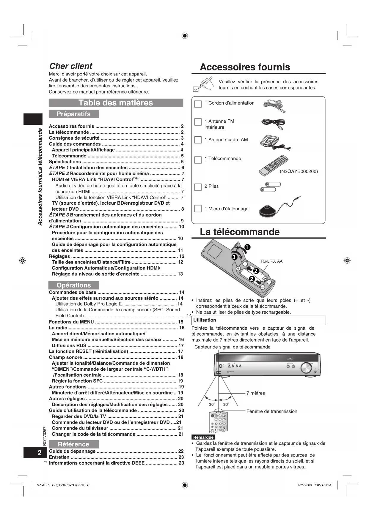 - Configuration Automatique/Configuration HDMI/Réglage du niveau de sortie d’enceinte Table des matières Préparatifs Cher client Merci d’avoir porté votre choix sur cet appareil.Avant de brancher, d’utiliser ou de régler cet appareil, veuillez lire l’ensemble des présentes instructions. Conservez ce manuel pour référence ultérieure. Accessoires fournis (N2QAYB000200) Veuillez vérifier la présence des accessoires fournis en cochant les cases correspondantes.1 Cordon d’alimentation1 Antenne FM intérieure1 Antenne-cadre AM1 Télécommande2 Piles p. 13