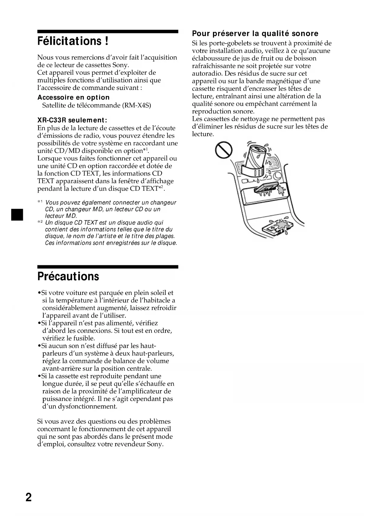- Si la cassette est reproduite pendant une longue durée, il se peut qu’elle s’échauffe en raison de la proximité de l’amplificateur de puissance intégré. Il ne s’agit cependant pas d’un dysfonctionnement. Si vous avez des questions ou des problèmes concernant le fonctionnement de cet appareil qui ne sont pas abordés dans le présent mode d’emploi, consultez votre revendeur Sony. Pour préserver la qualité sonore Si les porte-gobelets se trouvent à proximité de votre installation audio, veillez à ce qu’aucune éclaboussure de jus de fruit ou de boisson rafraîchissante ne soit projetée sur votre autoradio. Des résidus de sucre sur cet appareil ou sur la bande magnétique d’une cassette risquent d’encrasser les têtes de lecture, entraînant ainsi une altération de la qualité sonore ou empêchant carrément la reproduction sonore. Les cassettes de nettoyage ne permettent pas d’éliminer les résidus de sucre sur les têtes de lecture.3 Remarques à propos des cassettes Entretien des cassettes