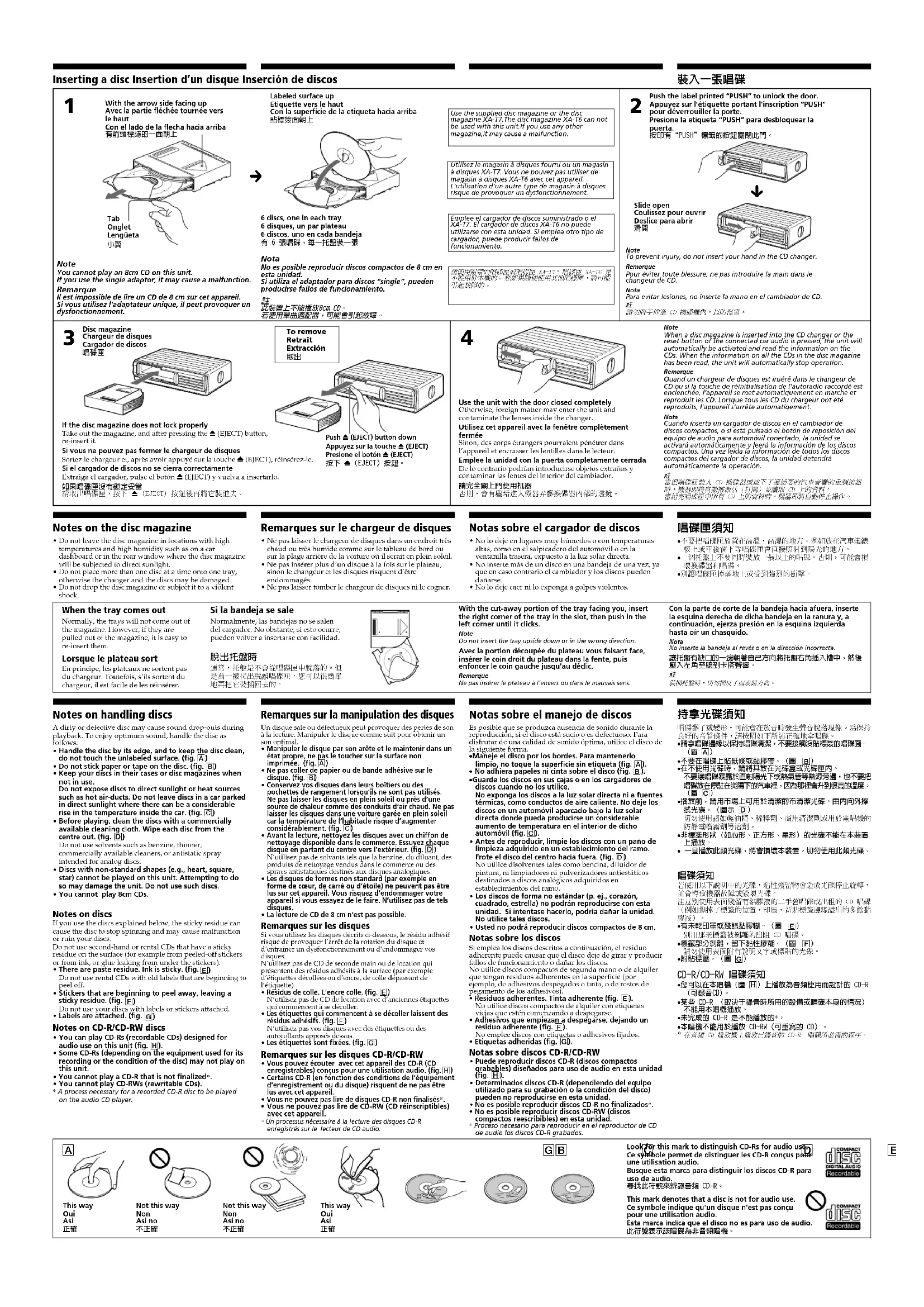 Notes on handling discs A dirty or defective disc may cause sound drop-outs duringplayback. To enjoy optimum sound, handle the disc asfollows.• Handle the disc by its edge, and to keep the disc clean,do not touch the unlabeled surface. (fig. A)• Do not stick paper or tape on the disc. (fig. B)• Keep your discs in their cases or disc magazines whennot in use.Do not expose discs to direct sunlight or heat sourcessuch as hot air-ducts. Do not leave discs in a car parkedin direct sunlight where there can be a considerablerise in the temperature inside the car. (fig. C)• Before playing, clean the discs with a commerciallyavailable cleaning cloth. Wipe each disc from thecentre out. (fig. D)Do not use solvents such as benzine, thinner,commercially available cleaners, or antistatic sprayintended for analog discs.• Discs with non-standard shapes (e.g., heart, square,star) cannot be played on this unit. Attempting to doso may damage the unit. Do not use such discs.• You cannot play 8cm CDs. Notes on discs If you use the discs explained below, the sticky residue cancause the disc to stop spinning and may cause malfunctionor ruin your discs.Do not use second-hand or rental CDs that have a stickyresidue on the surface (for example from peeled-off stickersor from ink, or glue leaking from under the stickers).• There are paste residue. Ink is sticky. (fig. E)Do not use rental CDs with old labels that are beginning topeel off.• Stickers that are beginning to peel away, leaving asticky residue. (fig. F)Do not use your discs with labels or stickers attached.• Labels are attached. (fig. G) Notes on CD-R/CD-RW discs • You can play CD-Rs (recordable CDs) designed foraudio use on this unit (fig. H).• Some CD-Rs (depending on the equipment used for itsrecording or the condition of the disc) may not play onthis unit. • You cannot play a CD-R that is not finalized*. • You cannot play CD-RWs (rewritable CDs).* A process necessary for a recorded CD-R disc to be playedon the audio CD player. Notas sobre el manejo de discos Es posible que se produzca ausencia de sonido durante lareproducción, si el disco está sucio o es defectuoso. Paradisfrutar de una calidad de sonido óptima, utilice el disco dela siguiente forma.• Maneje el disco por los bordes. Para mantenerlolimpio, no toque la superficie sin etiqueta (fig. A). • No adhiera papeles ni cinta sobre el disco (fig. B). • Guarde los discos en sus cajas o en los cargadores dediscos cuando no los utilice.No exponga los discos a la luz solar directa ni a fuentestérmicas, como conductos de aire caliente. No deje losdiscos en un automóvil aparcado bajo la luz solardirecta donde pueda producirse un considerableaumento de temperatura en el interior de dichoautomóvil (fig. C).• Antes de reproducir, limpie los discos con un paño delimpieza adquirido en un establecimiento del ramo.Frote el disco del centro hacia fuera. (fig. D)No utilice disolventes tales como bencina, diluidor depintura, ni limpiadores ni pulverizadores antiestáticosdestinados a discos analógicos adquiridos enestablecimientos del ramo.• Los discos de forma no estándar (p. ej., corazón,cuadrado, estrella) no podrán reproducirse con estaunidad. Si intentase hacerlo, podría dañar la unidad.No utilice tales discos.• Usted no podrá reproducir discos compactos de 8 cm. Notas sobre los discos Si emplea los discos descritos a continuación, el residuoadherente puede causar que el disco deje de girar y producirfallos de funcionamiento o dañar los discos.No utilice discos compactos de segunda mano o de alquilerque tengan residuos adherentes en la superficie (porejemplo, de adhesivos despegados o tinta, o de restos depegamento de los adhesivos).• Residuos adherentes. Tinta adherente (fig. E).No utilice discos compactos de alquiler con etiquetasviejas que estén comenzando a despegarse.• Adhesivos que empiezan a despegarse, dejando unresiduo adherente (fig. F).No emplee discos con etiquetas o adhesivos fijados.• Etiquetas adheridas (fig. G). Notas sobre discos CD-R/CD-RW • Puede reproducir discos CD-R (discos compactosgrabables) diseñados para uso de audio en esta unidad(fig. H).• Determinados discos CD-R (dependiendo del equipoutilizado para su grabación o la condición del disco)pueden no reproducirse en esta unidad. • No es posible reproducir discos CD-R no finalizados*. • No es posible reproducir discos CD-RW (discoscompactos reescribibles) en esta unidad.* Proceso necesario para reproducir en el reproductor de CDde audio los discos CD-R grabados. Remarques sur la manipulation des disques Un disque sale ou défectueux peut provoquer des pertes de sonà la lecture. Manipuler le disque comme suit pour obtenir unson optimal.• Manipuler le disque par son arête et le maintenir dans unétat propre, ne pas le toucher sur la surface nonimprimée. (fig. A