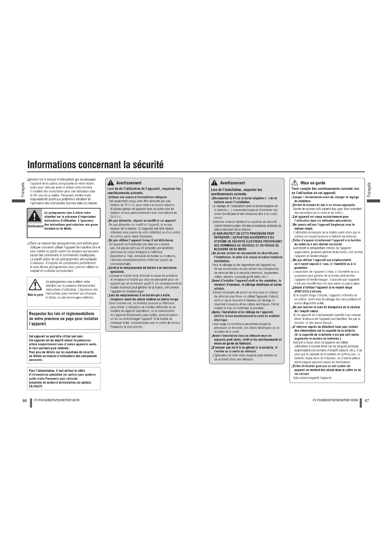 Veuillieziremanueld'instructionsquiacompagné l'apparoli etlesautrascomponantsdevoitrachainc audio pourvehicuavantd'utilisercesederniere. Ilcontiendesinstructionspourunutilisationseréeteffacede lachaine.Panasonicdecline toutecosponsablenquantauxproblèmesresultantde l'ignorancedesinstrukturedoufionsdecesmanuel