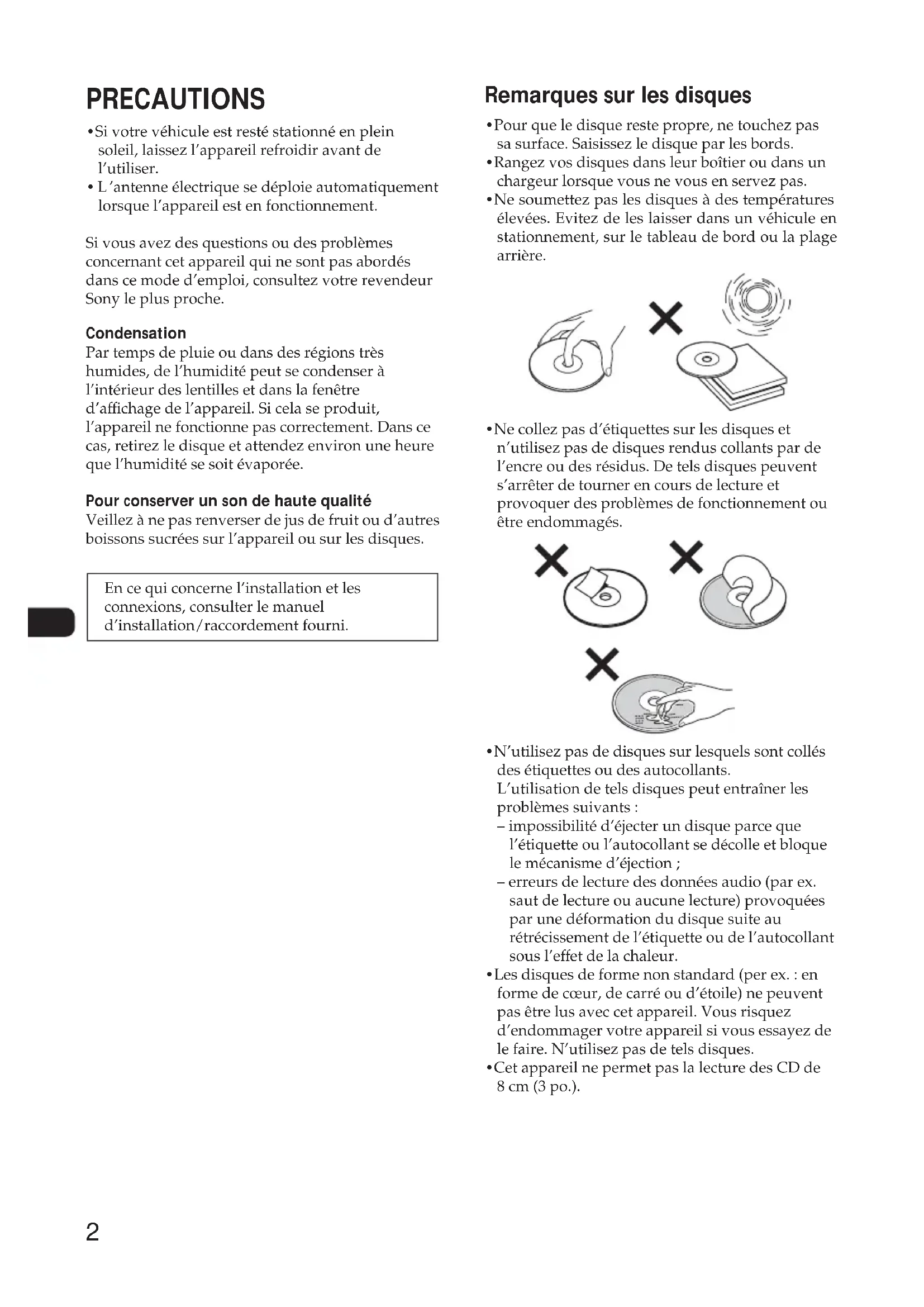 - erreurs de lecture des données audio (par ex. saut de lecture ou aucune lecture) provoquées par une déformation du disque suite au rétrécissement de l'étiquette ou de l'autocollant sous l'effet de la chaleur.
