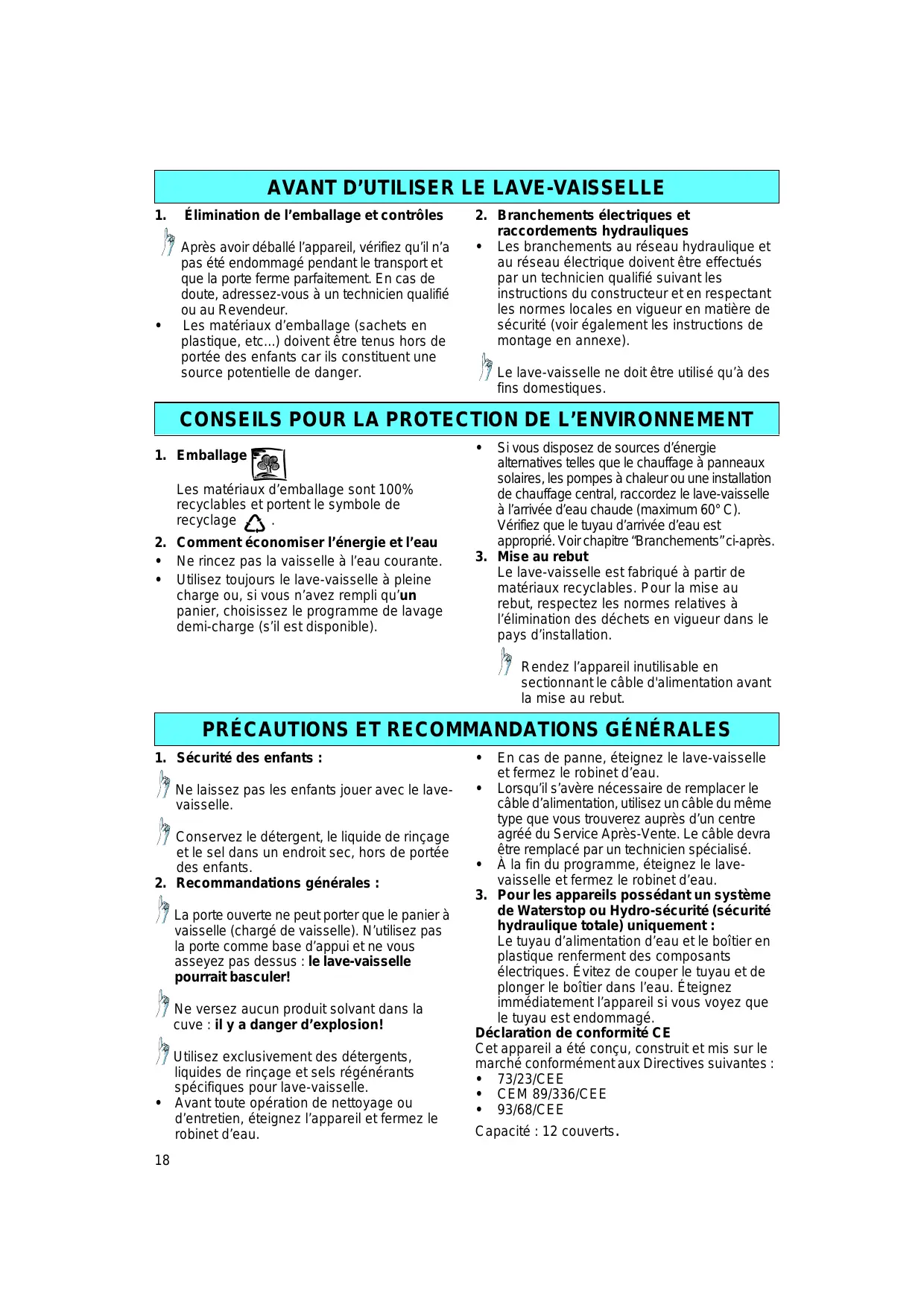 - Les branchements au réseau hydraulique et au réseau électrique doivent être effectués par un technicien qualifié suivant les instructions du constructeur et en respectant les normes locales en vigueur en matière de sécurité (voir également les instructions de montage en annexe). Le lave-vaisselle ne doit être utilisé qu’à des fins domestiques. CONSEILS POUR LA PROTECTION DE L’ENVIRONNEMENT