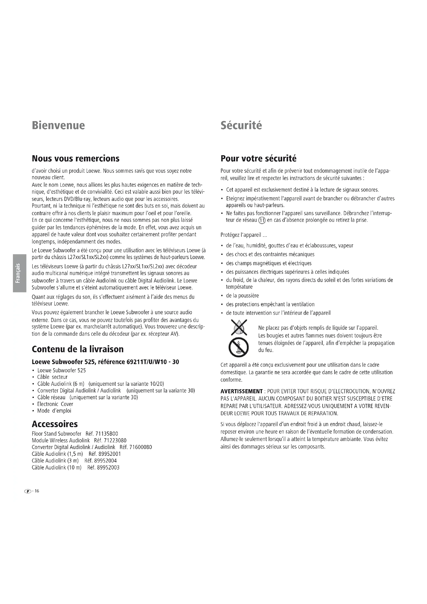 système Loewe (par ex. marche/arrêt automatique). Vous trouverez une descrip- tion de la commande dans celle du décodeur (par ex. récepteur AV). Contenu de la livraison Loewe Subwoofer 525, référence 69211T/U/W10 - 30