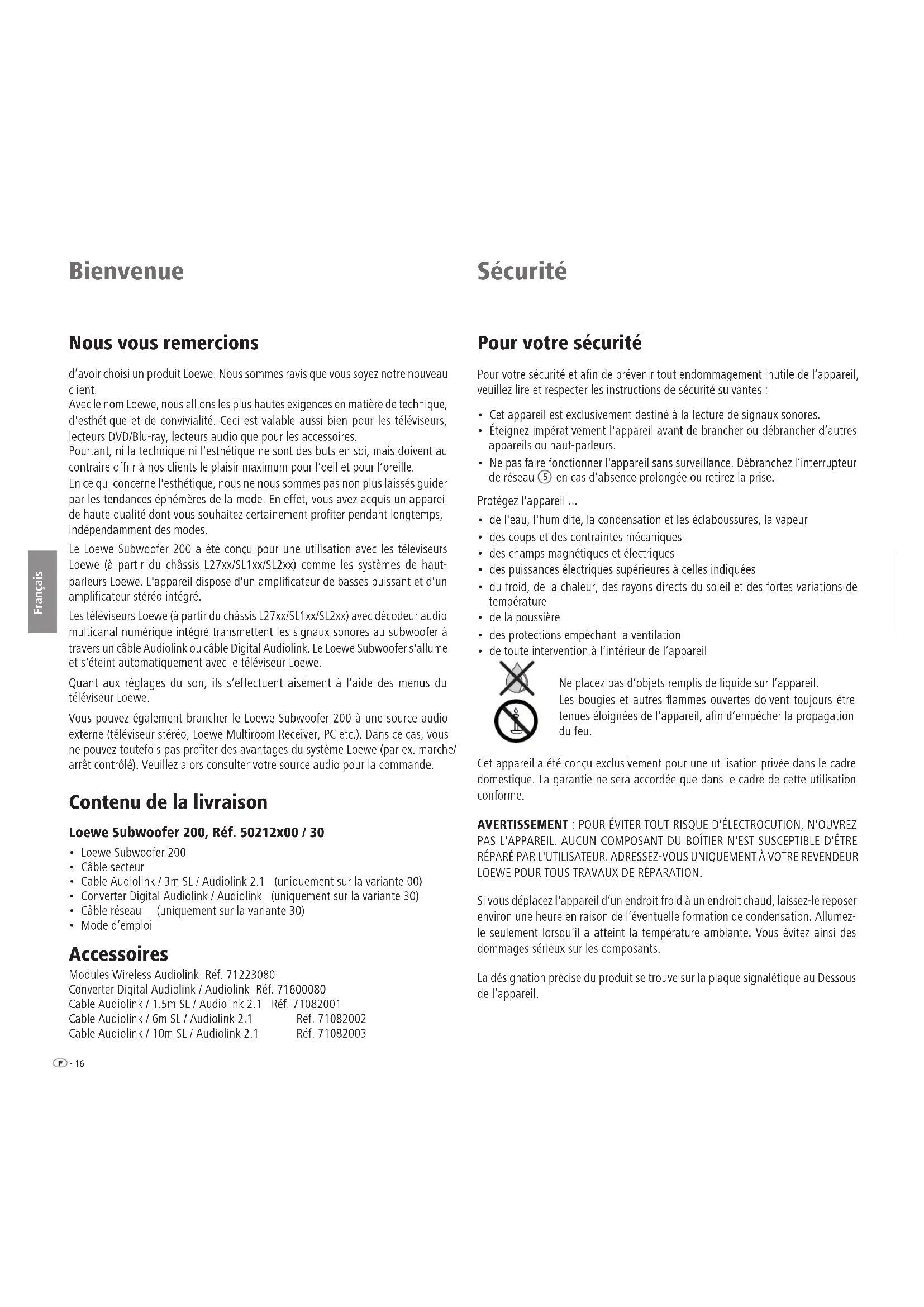 to set the basic bass volume to how you want it.15 - Deutsch English Français Italiano Español Nederlands Technical Data Loewe Subwoofer 200 Order no. 50212T/U/W Operating temperature [°C] 5 ... 40 Humidity [%] (no condensation) 30 ... 90 Dimensions [W x H x D in cm] 24 x 24.5 x 26.1 Weight [kg] 5.2 Digital power ampliers 3 Principle 1 way bass reex, active Equipment 1 x bass 160 mm Load capacity of the subwoofer channel 100 (sinus) / 200 watt (max. music) Load capacity of other channels 2x 50 (sinus) / 100 watt (max. music) Mains voltage [volt 50/60 Hz] 220 - 240V Max. power consumption [Watt] 250 Nominal power consumption [Watt] 35 Power consumption on standby [watt] < 0.5 Power consumption Power OFF [Watt] 0 Bass intensity [dB] ±12 Transmission range of the subwoofer (acoustic) 39 Hz – 350 Hz - 3dB Transmission range of other channels 20 Hz – 20 kHz - 3dB Speaker impedance [Ohm] min. 4 Mains switch yes Operating mode switch 2 Integrated bass manager Yes Signal detector Yes Line In RCA socket 3x: Right, Subw, Left System link Audiolink 26-pin D-Sub Masthead Loewe Opta GmbH is a public limited company of German law with its Head Office in Kronach. Loewe Opta GmbH Industriestrasse 11, 96317 Kronach Editing date 04.13. 4rd issue © Loewe Opta GmbH, Kronach All rights reserved including translation. Design and technical specifications are subject to change without notice. Disposal Cardboard box and packaging In line with national regulations regarding the disposal of packaging materials, we pay a fee to authorised recyclers who collect packaging from dealers. Never- theless, we recommend that you keep the original cardboard box and the rest of the packaging materials so that the unit can, if necessary, be transported in the safest possible conditions. The unit Attention: The EU Directive 2002/96/EC governs the proper return, handling and recycling of used electronic appliances. Old electronic appliances must therefore be disposed of separately. Never dispose of this unit in the normal domestic waste! You can hand in your old unit free of charge at identied collection points or to your dealer if you buy a similar new unit. Other details about re-acceptance (also for non-EU countries) are available from your local authorities.- 16 Deutsch English Français Italiano Español Nederlands Bienvenue Nous vous remercions d’avoir choisi un produit Loewe. Nous sommes ravis que vous soyez notre nouveau client. Avec le nom Loewe, nous allions les plus hautes exigences en matière de technique, d'esthétique et de convivialité. Ceci est valable aussi bien pour les téléviseurs, lecteurs DVD/Blu-ray, lecteurs audio que pour les accessoires. Pourtant, ni la technique ni l‘esthétique ne sont des buts en soi, mais doivent au contraire offrir à nos clients le plaisir maximum pour l‘oeil et pour l‘oreille. En ce qui concerne l'esthétique, nous ne nous sommes pas non plus laissés guider par les tendances éphémères de la mode. En effet, vous avez acquis un appareil de haute qualité dont vous souhaitez certainement proter pendant longtemps, indépendamment des modes. Le Loewe Subwoofer 200 a été conçu pour une utilisation avec les téléviseurs Loewe (à partir du châssis L27xx/SL1xx/SL2xx) comme les systèmes de haut- parleurs Loewe. L'appareil dispose d'un amplicateur de basses puissant et d'un amplicateur stéréo intégré. Les téléviseurs Loewe (à partir du châssis L27xx/SL1xx/SL2xx) avec décodeur audio multicanal numérique intégré transmettent les signaux sonores au subwoofer à travers un câble Audiolink ou câble Digital Audiolink. Le Loewe Subwoofer s'allume et s'éteint automatiquement avec le téléviseur Loewe. Quant aux réglages du son, ils s’effectuent aisément à l’aide des menus du téléviseur Loewe. Vous pouvez également brancher le Loewe Subwoofer 200 à une source audio externe (téléviseur stéréo, Loewe Multiroom Receiver, PC etc.). Dans ce cas, vous ne pouvez toutefois pas proter des avantages du système Loewe (par ex. marche/ arrêt contrôlé). Veuillez alors consulter votre source audio pour la commande. Contenu de la livraison Loewe Subwoofer 200, Réf. 50212x00 / 30