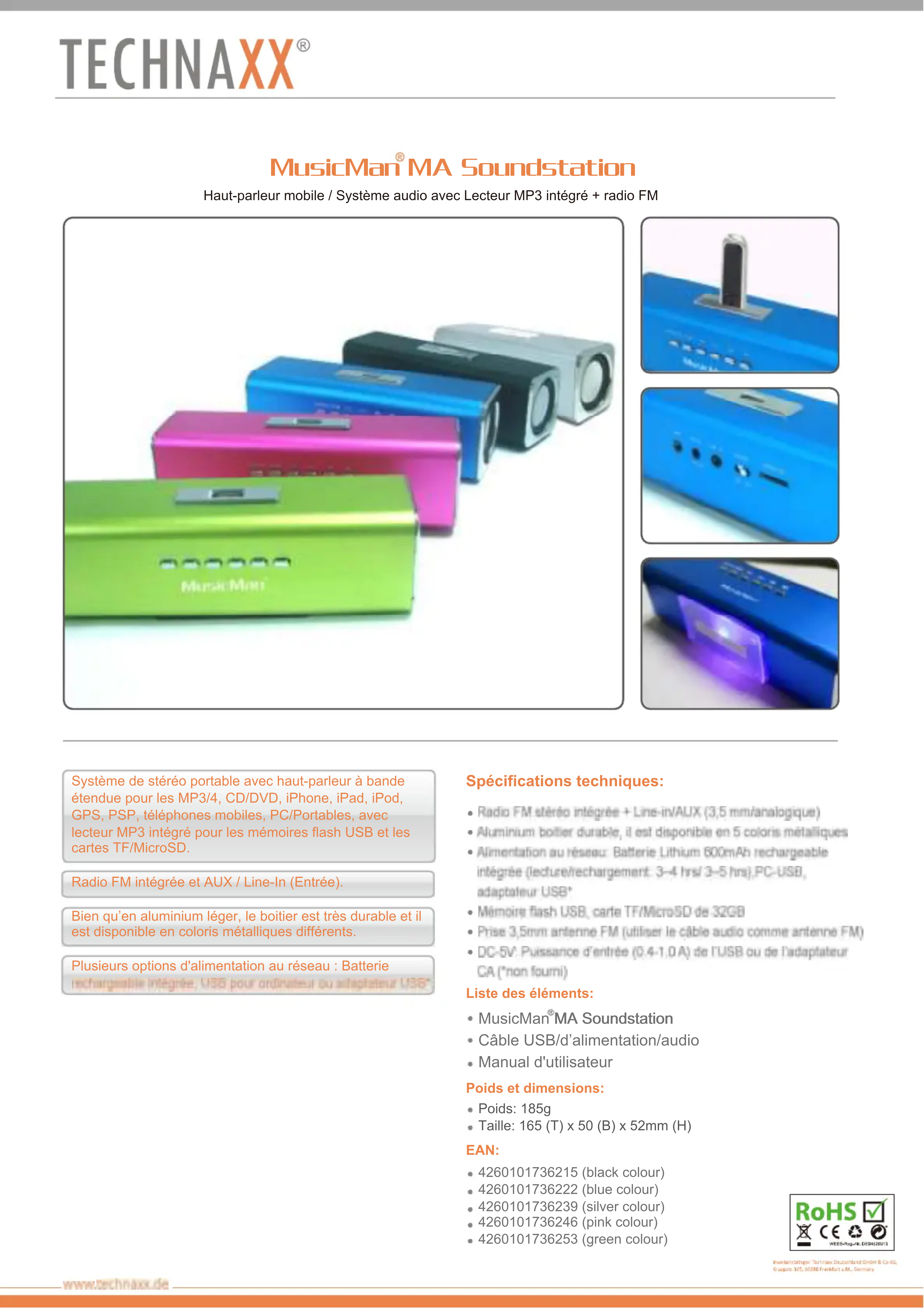 MusicMan MA Soundstation - Haut-parleur TECHNAXX - Notice d'utilisation et mode d'emploi gratuit