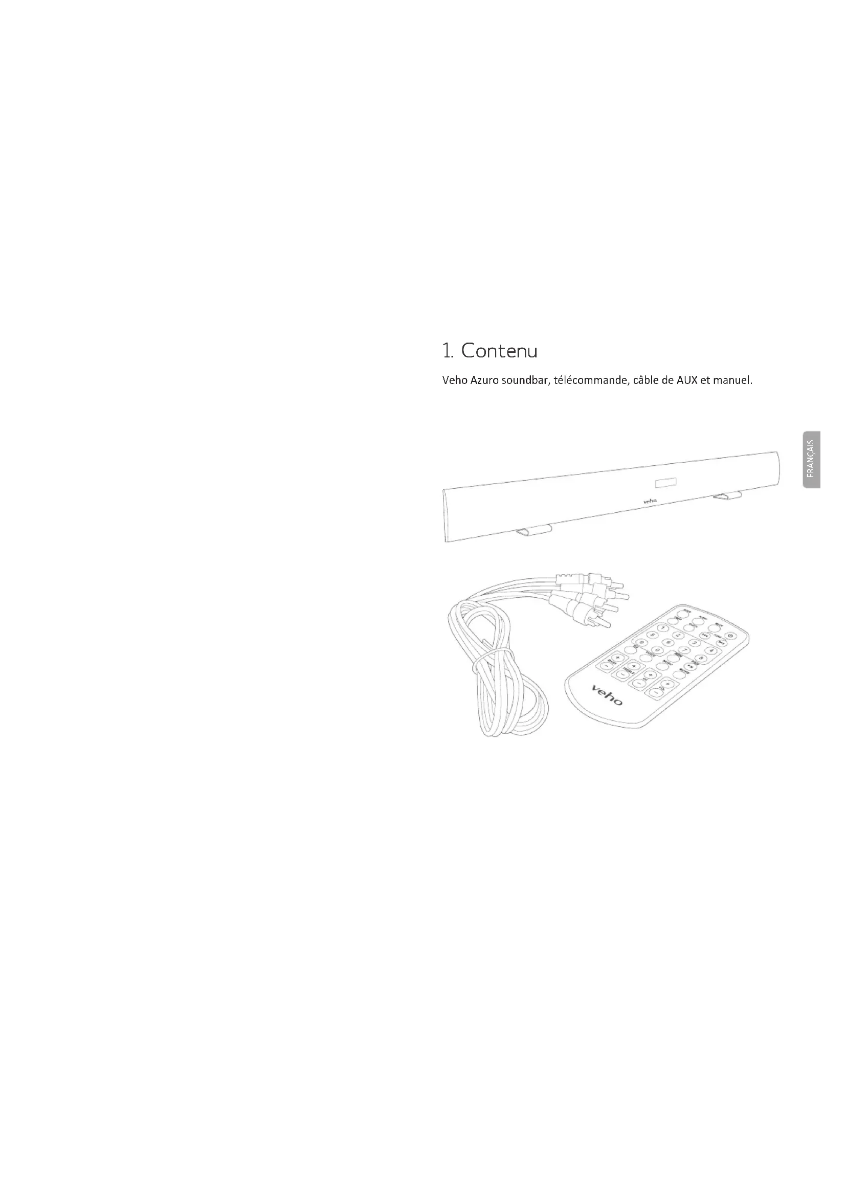 Veho Azuro soundbar, télécommande, câble de AUX et manuel.FRANÇAIS