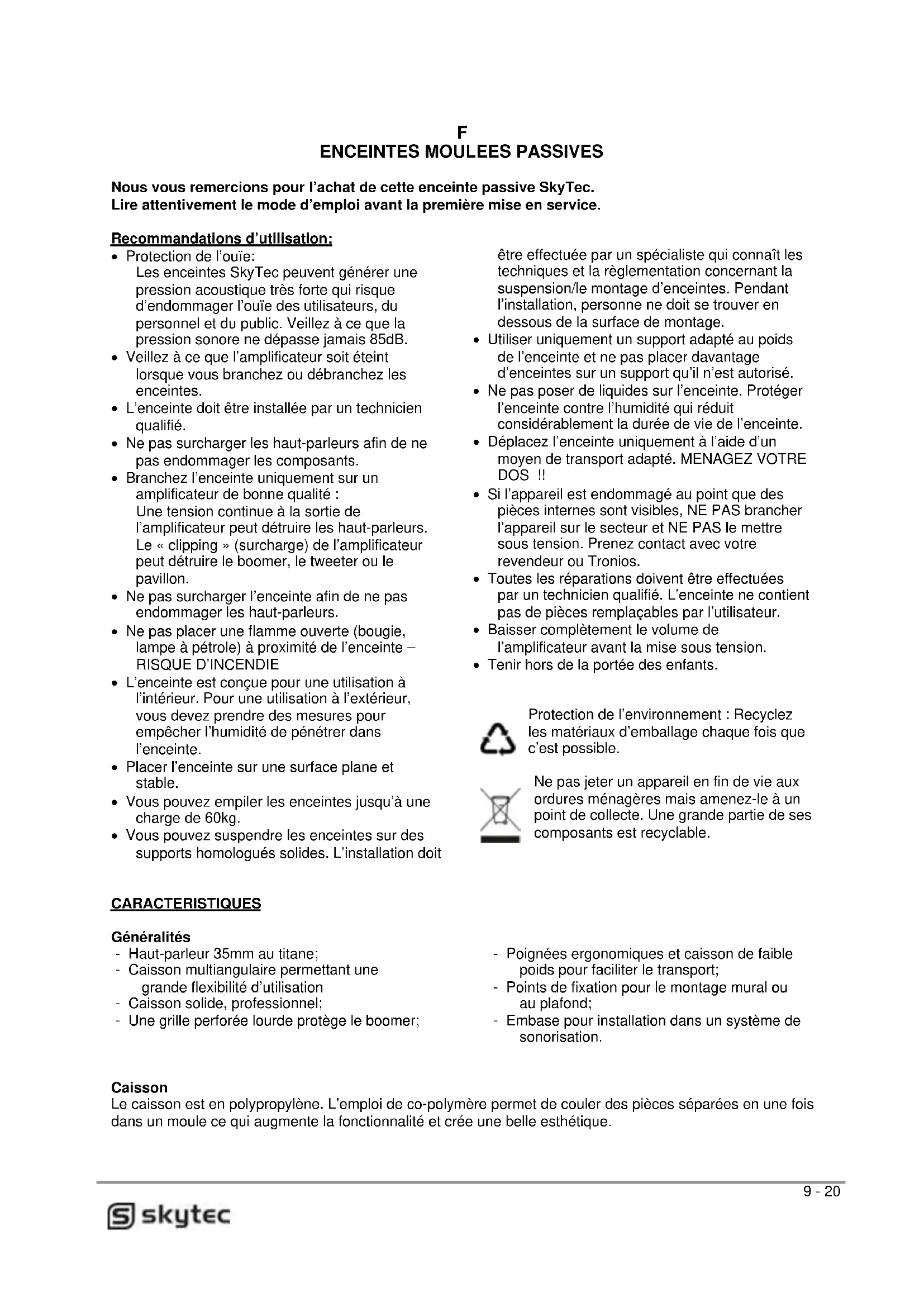 Nous vous remercions pour l'achat de cette enceinte passive SkyTec. Lire attentivement le mode d'emploi avant la première mise en service.